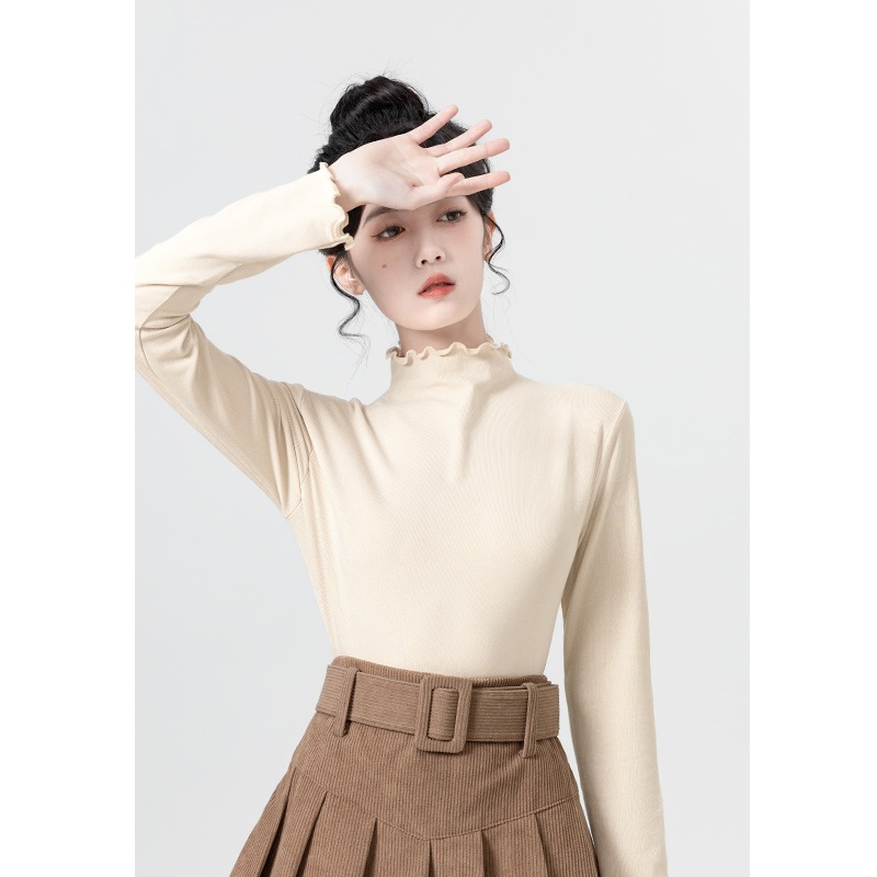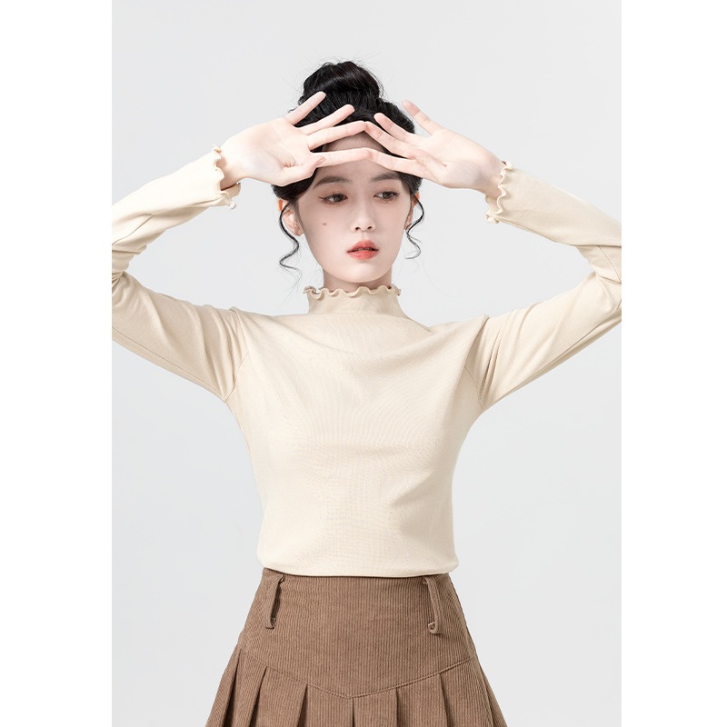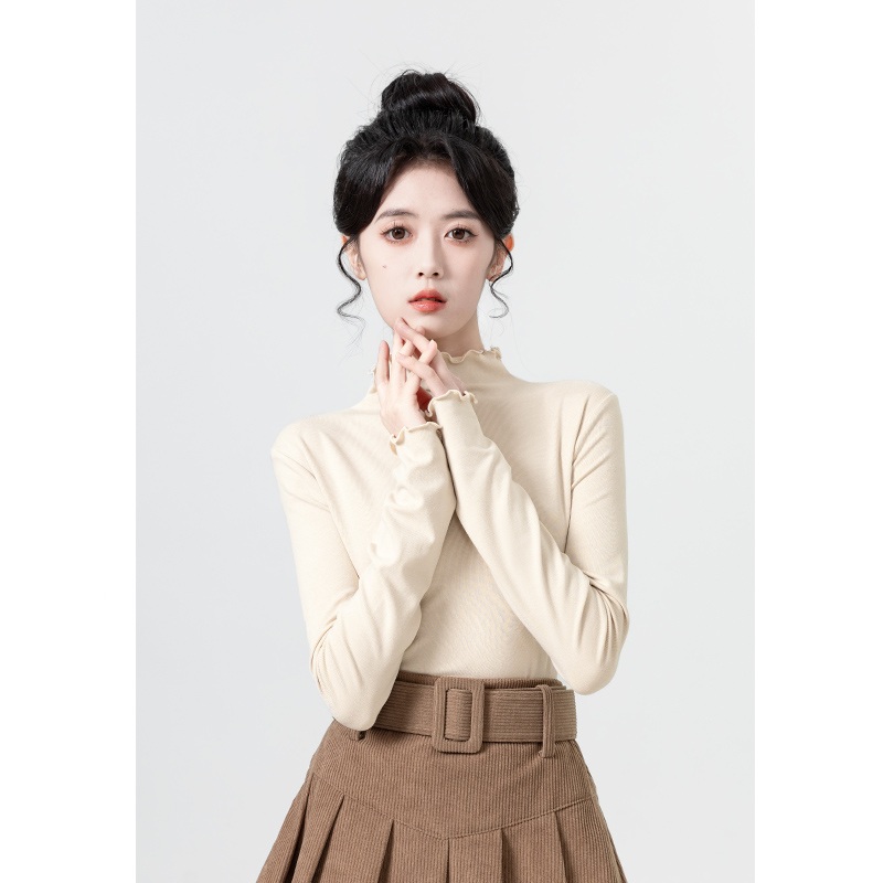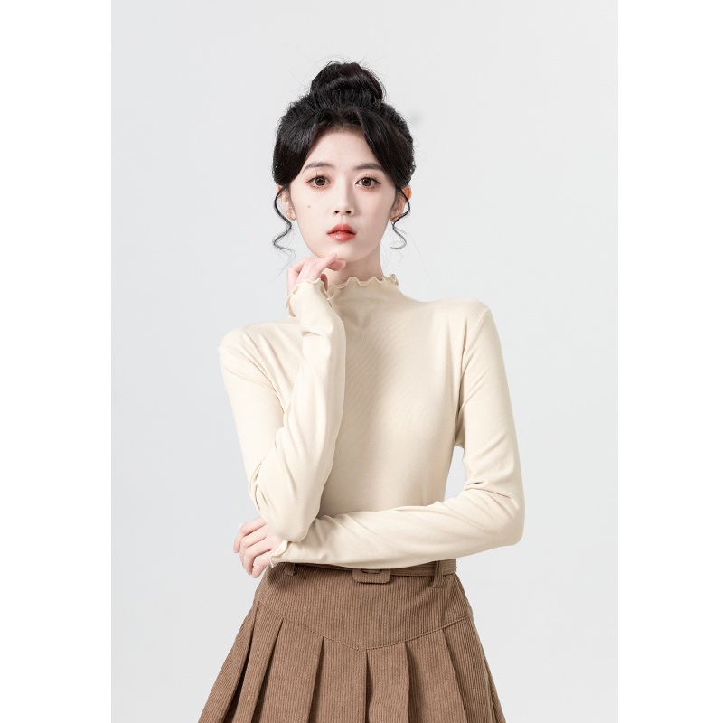 杏色木耳边半高领打底衫女春秋2025新款修身百搭长袖恤内搭上衣