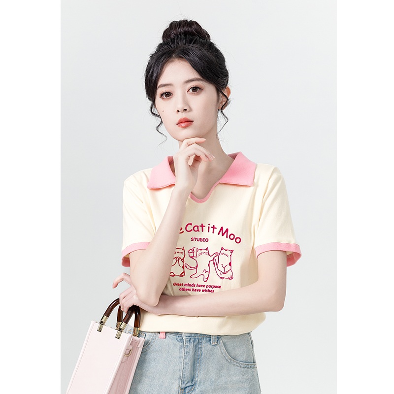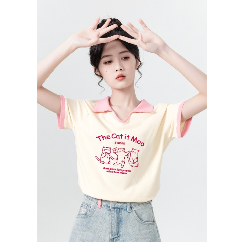 撞色翻领短袖T恤女夏季2025新款宽松设计感甜美V领polo衫正肩上衣