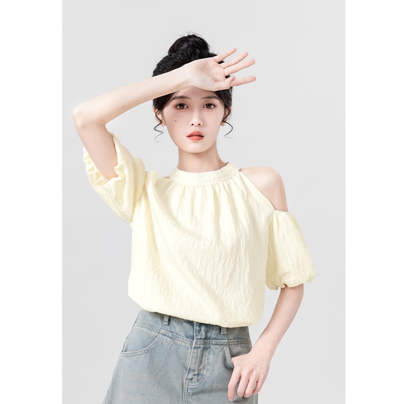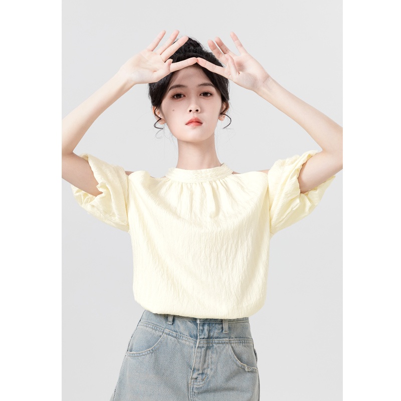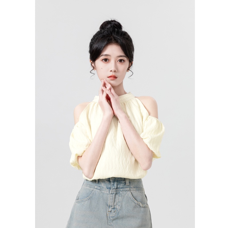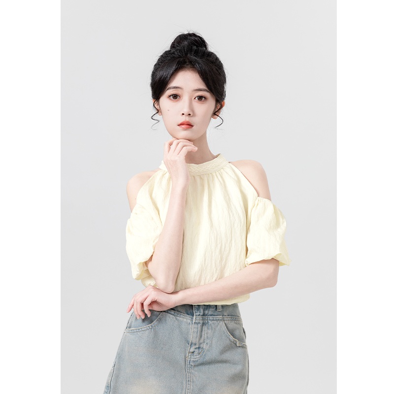 杏色挂脖绑带短袖衬衫女夏2025新款设计感法式泡泡袖衬衣露肩上衣