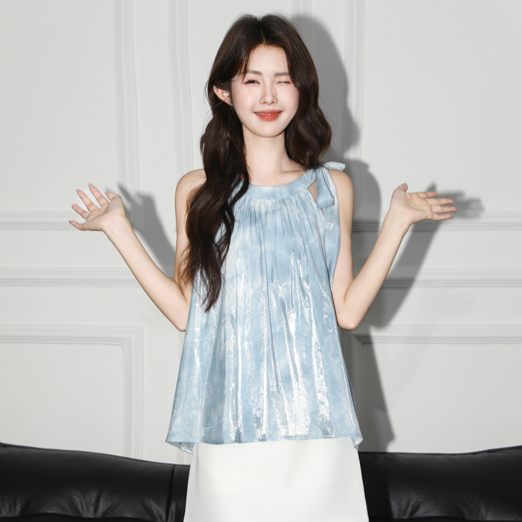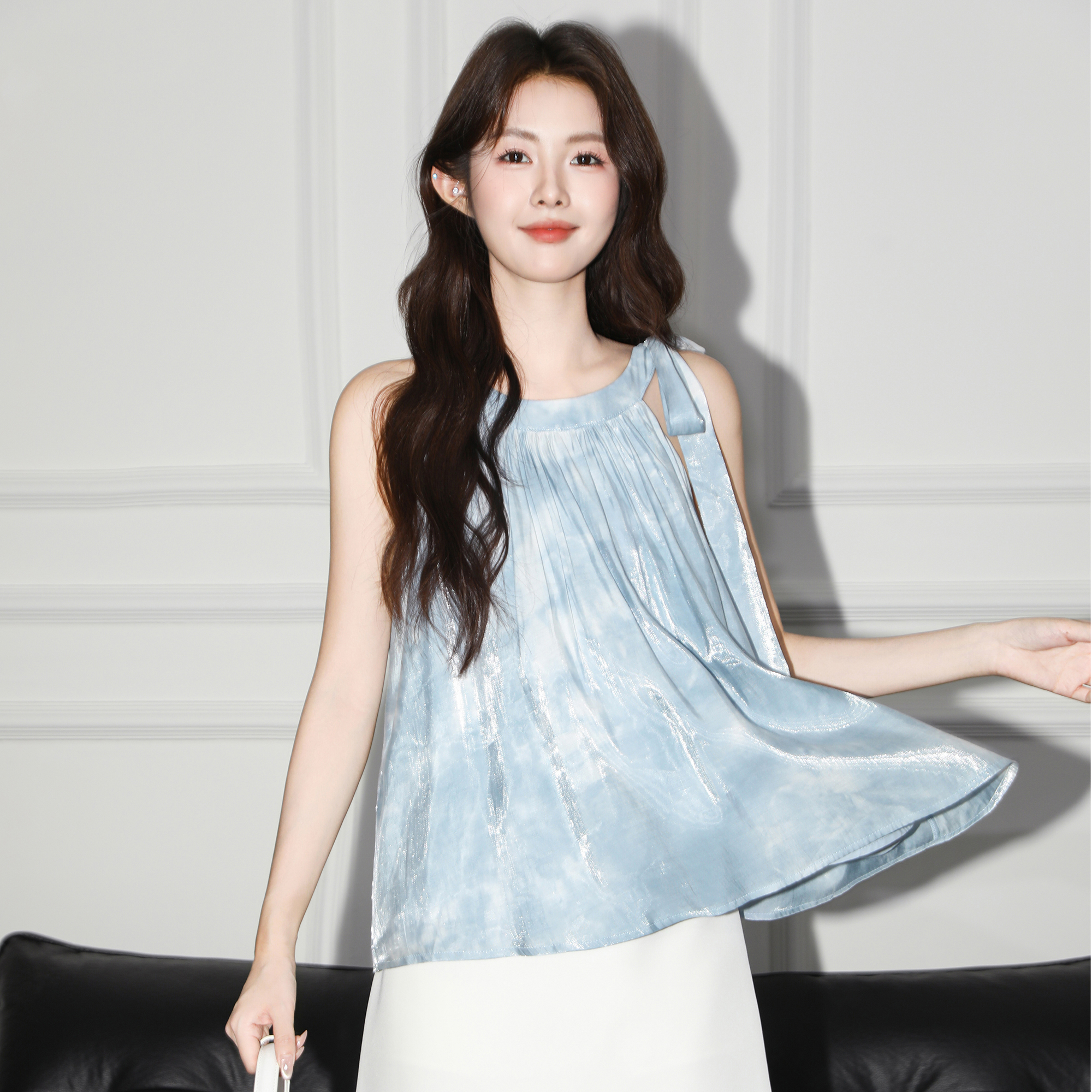 蓝色晕染吊带背心女夏2025夏季新款法式绝美挂脖宽松无袖露肩上衣