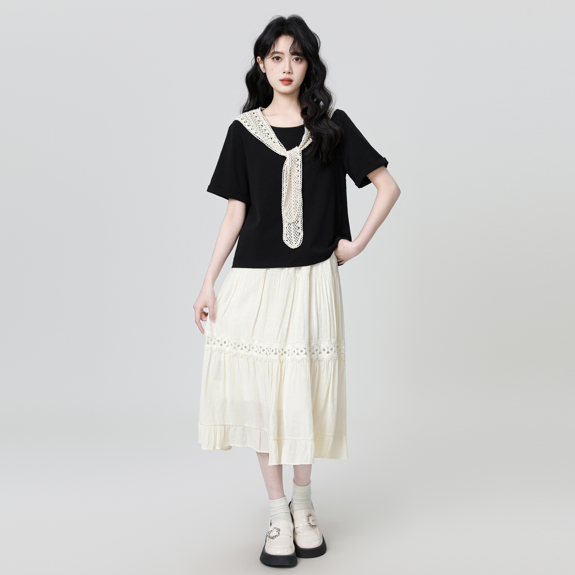 假两件披肩短袖恤女夏2025夏季新款设计感拼接黑色体恤半袖上衣