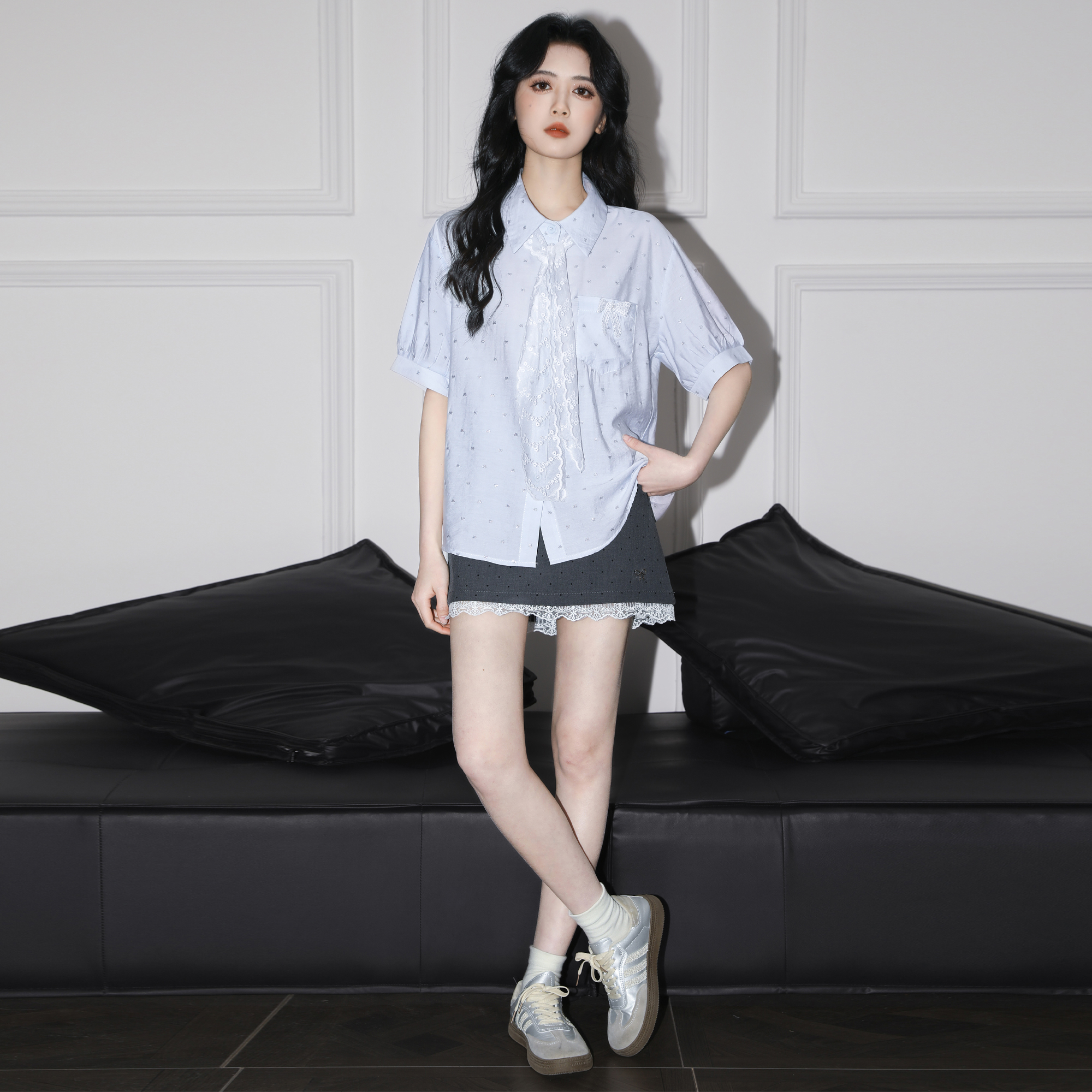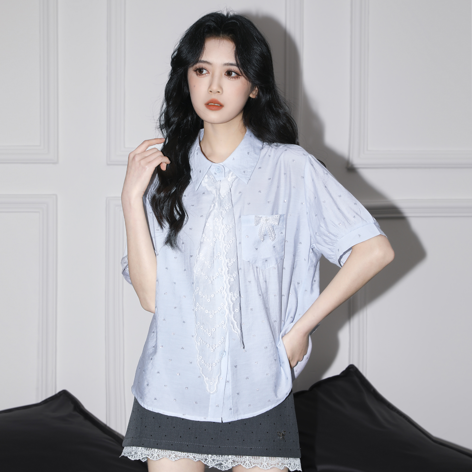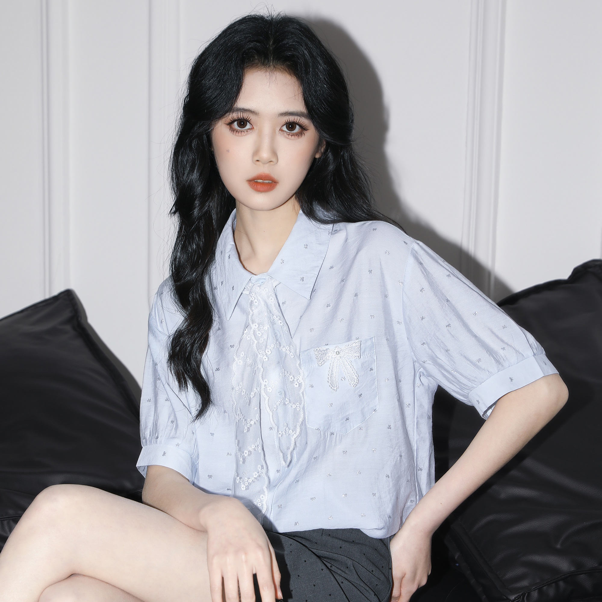 法式蕾丝系带短袖衬衫女夏2025夏季新款设计感泡泡袖衬衣别致上衣