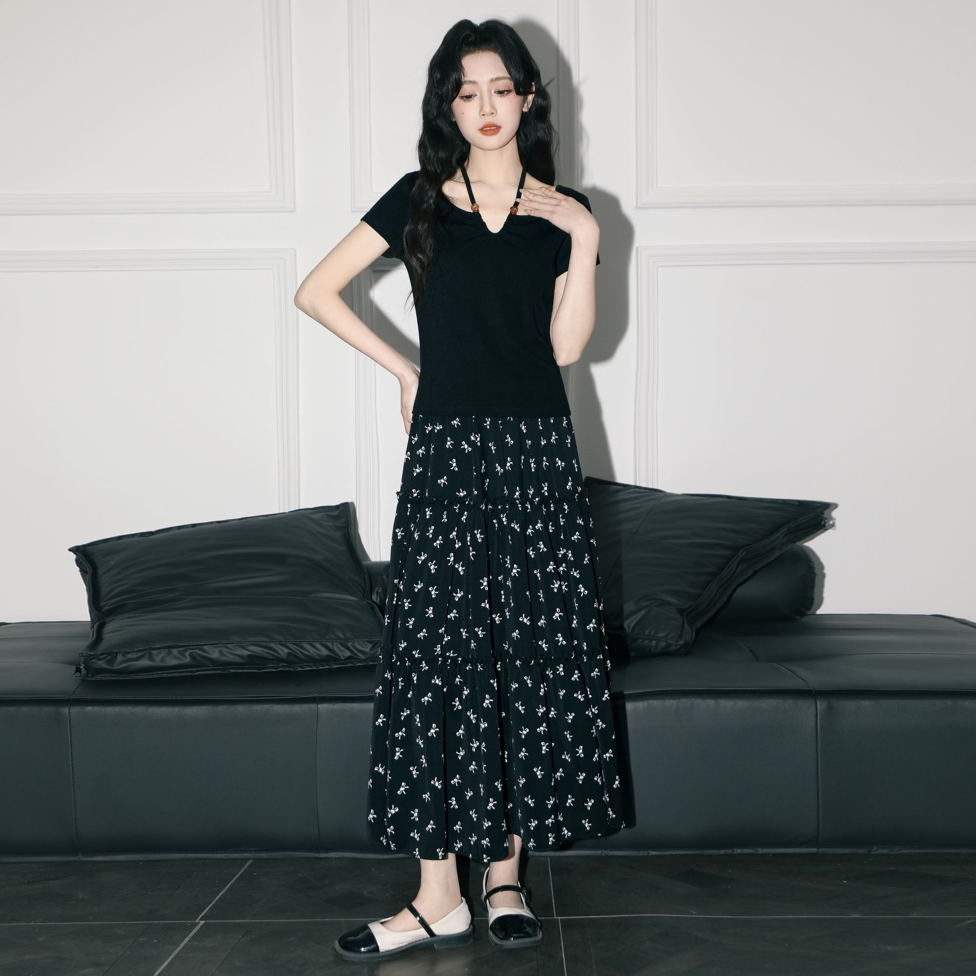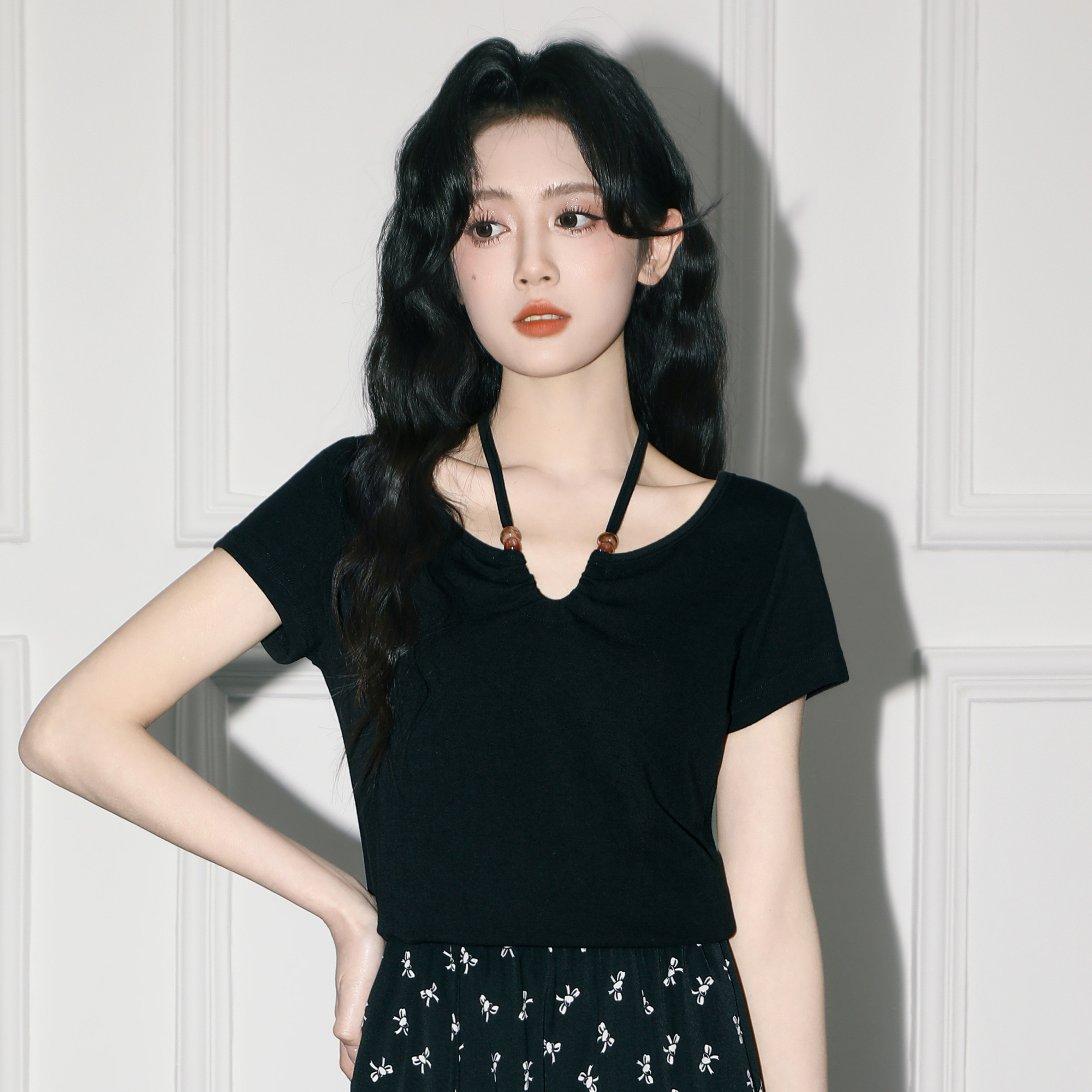 黑色挂脖短袖T恤女夏季2025春新款设计感V领正肩体恤别致短款上衣