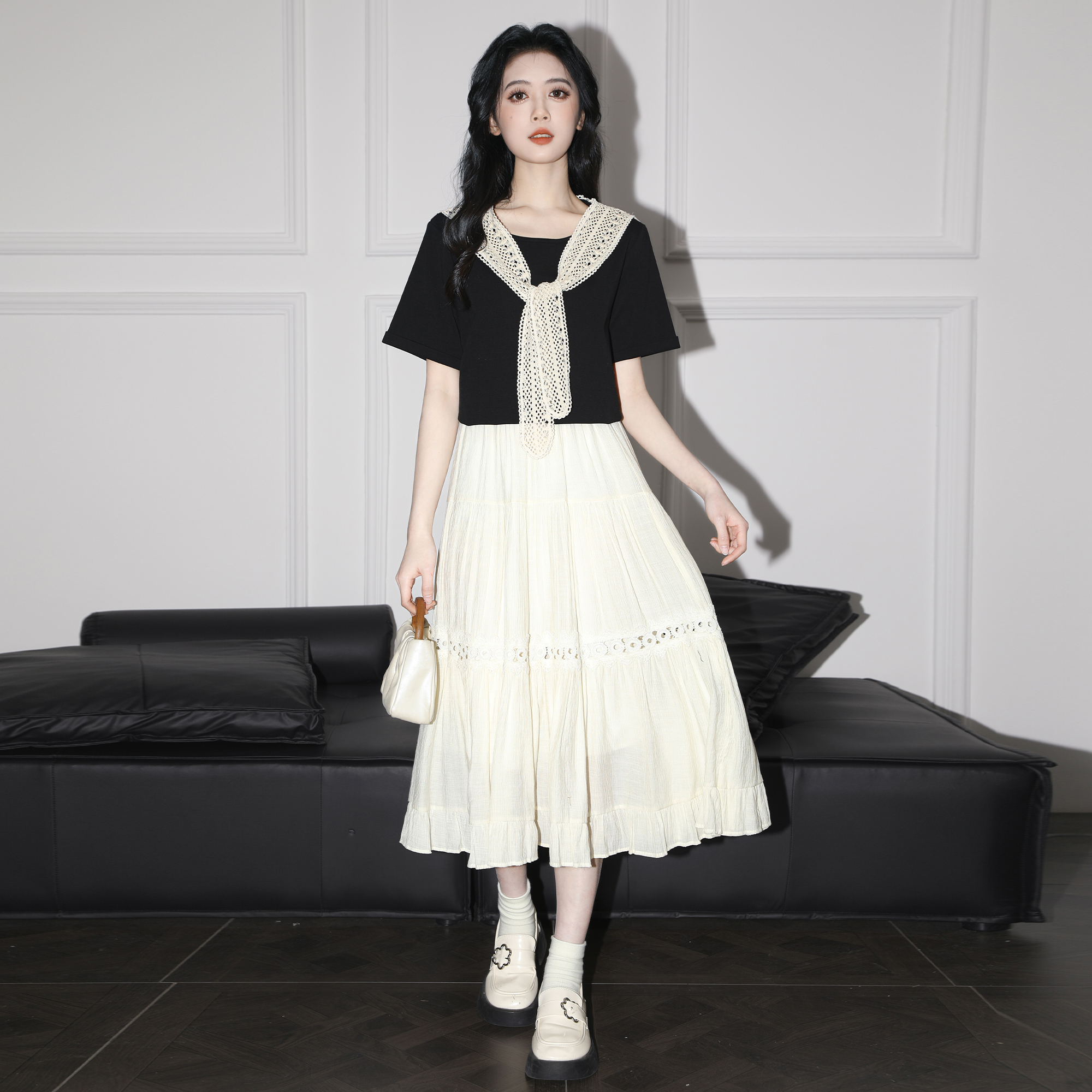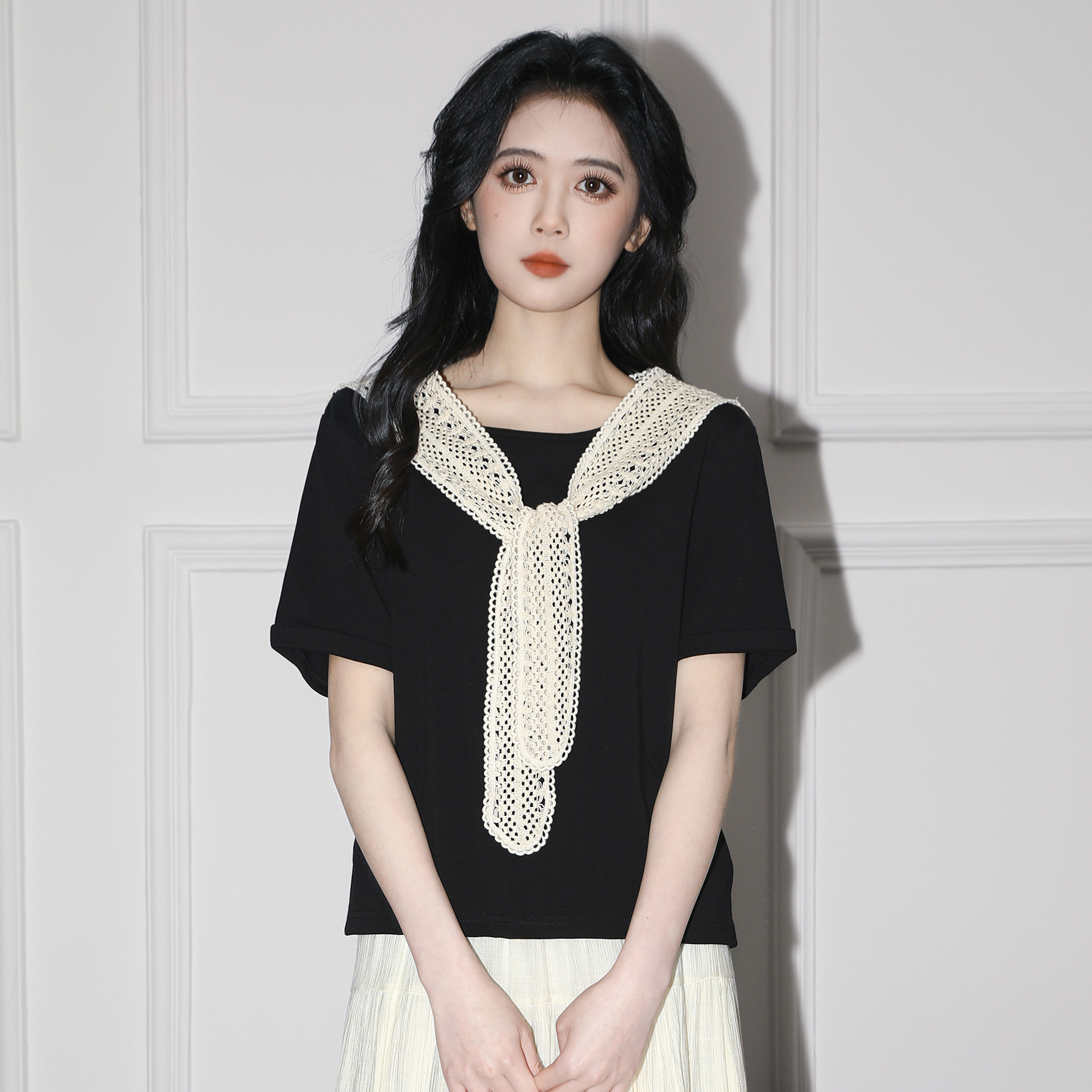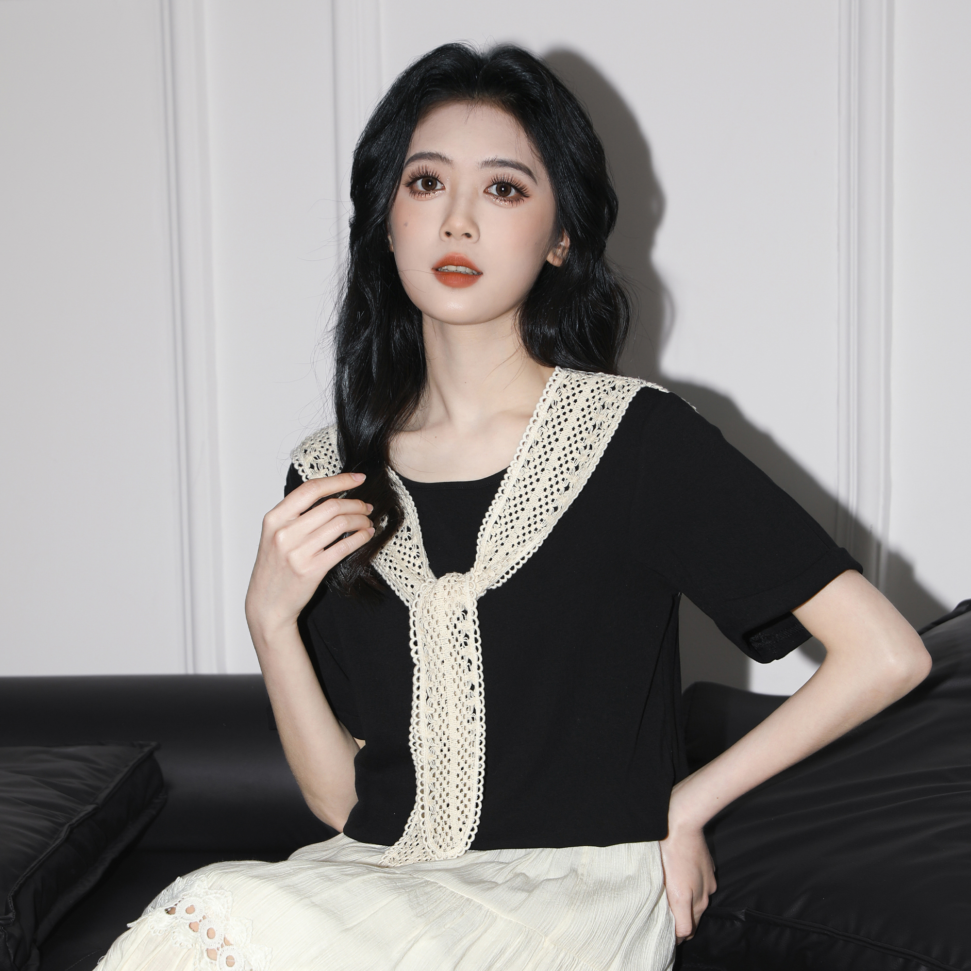 黑色假两件短袖T恤女夏2025夏季新款设计感蕾丝披肩体恤正肩上衣