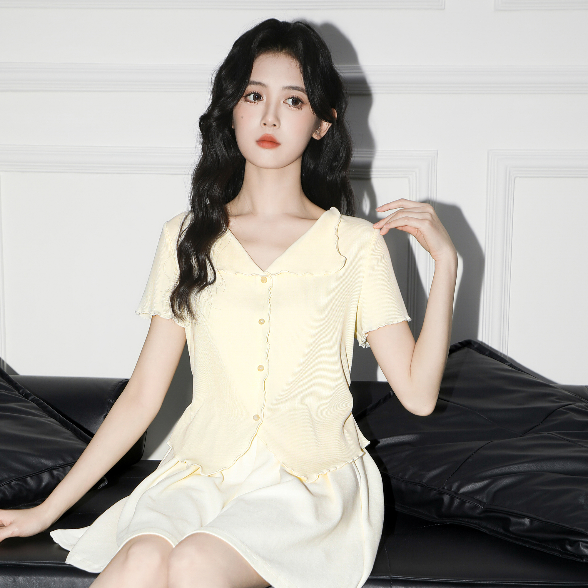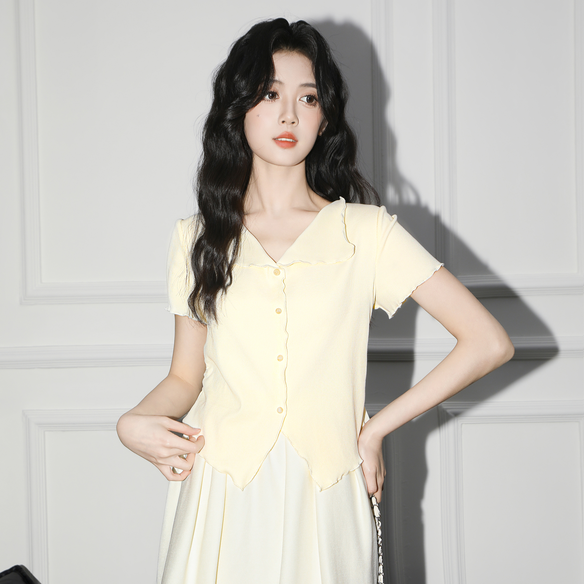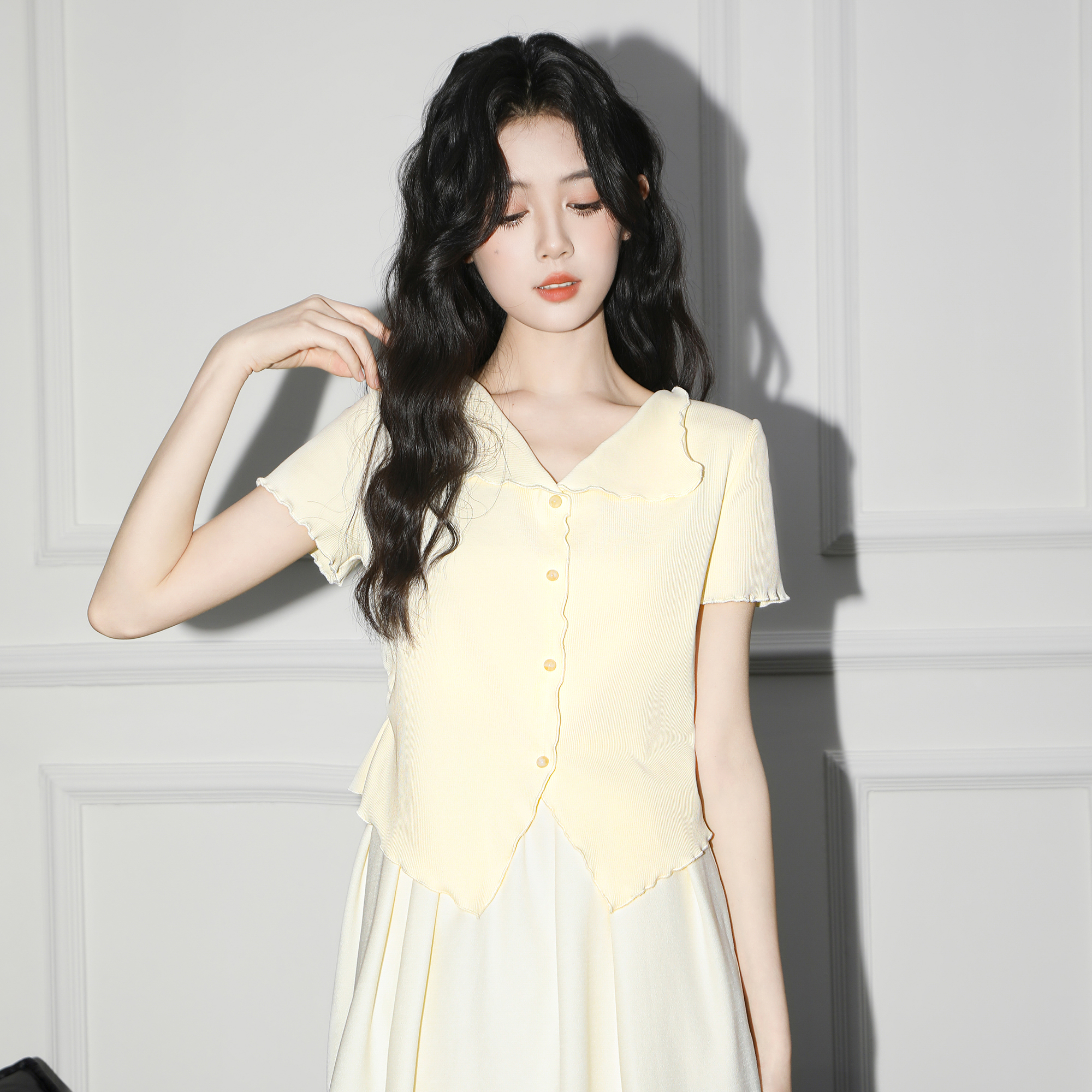 杏色木耳边短袖T恤女夏2025夏季新款不规则褶皱显瘦体恤短款上衣