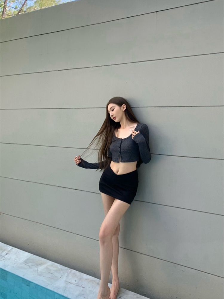 6535棉夏季超火设计感小众纽扣短袖T恤女短款高腰修身上衣服