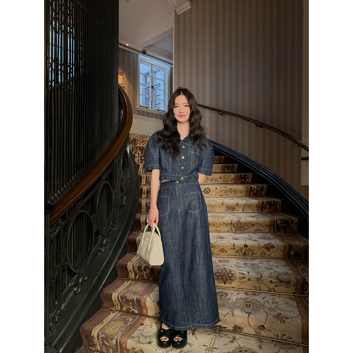 诠释美 NEW OPEN夏季港风牛仔裙套装女款半裙衬衫两件套81269