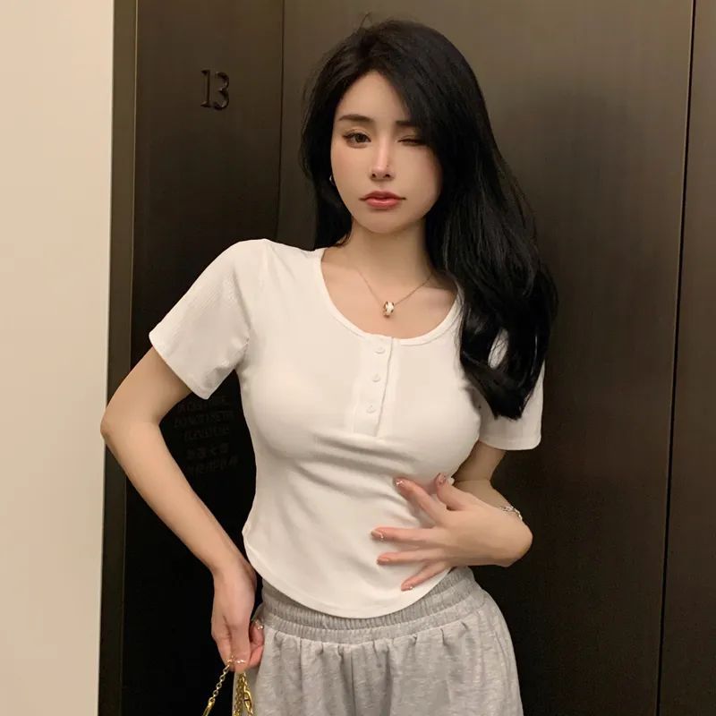 夏韩版百搭圆领设计感正肩短袖T恤女上衣美式洋气修身半纽扣