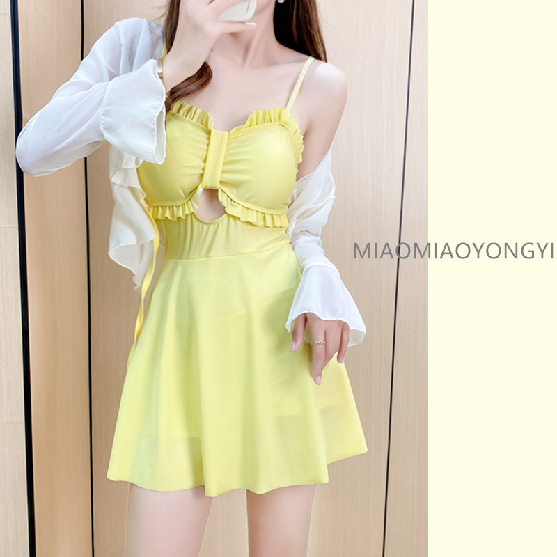【浪漫满屋】嫩黄泳衣女仙气温泉荷叶边罩衫连体平角保守显瘦泳装
