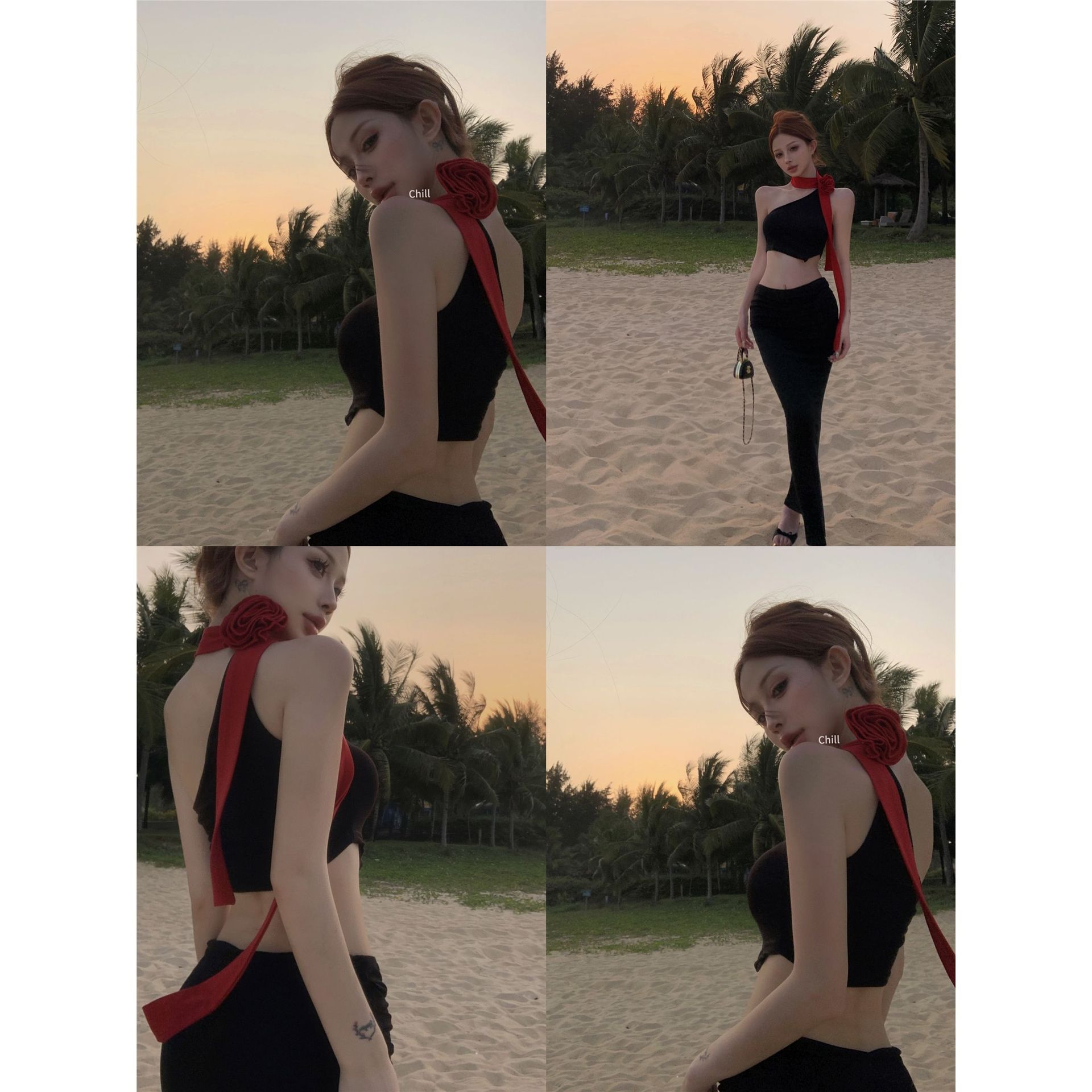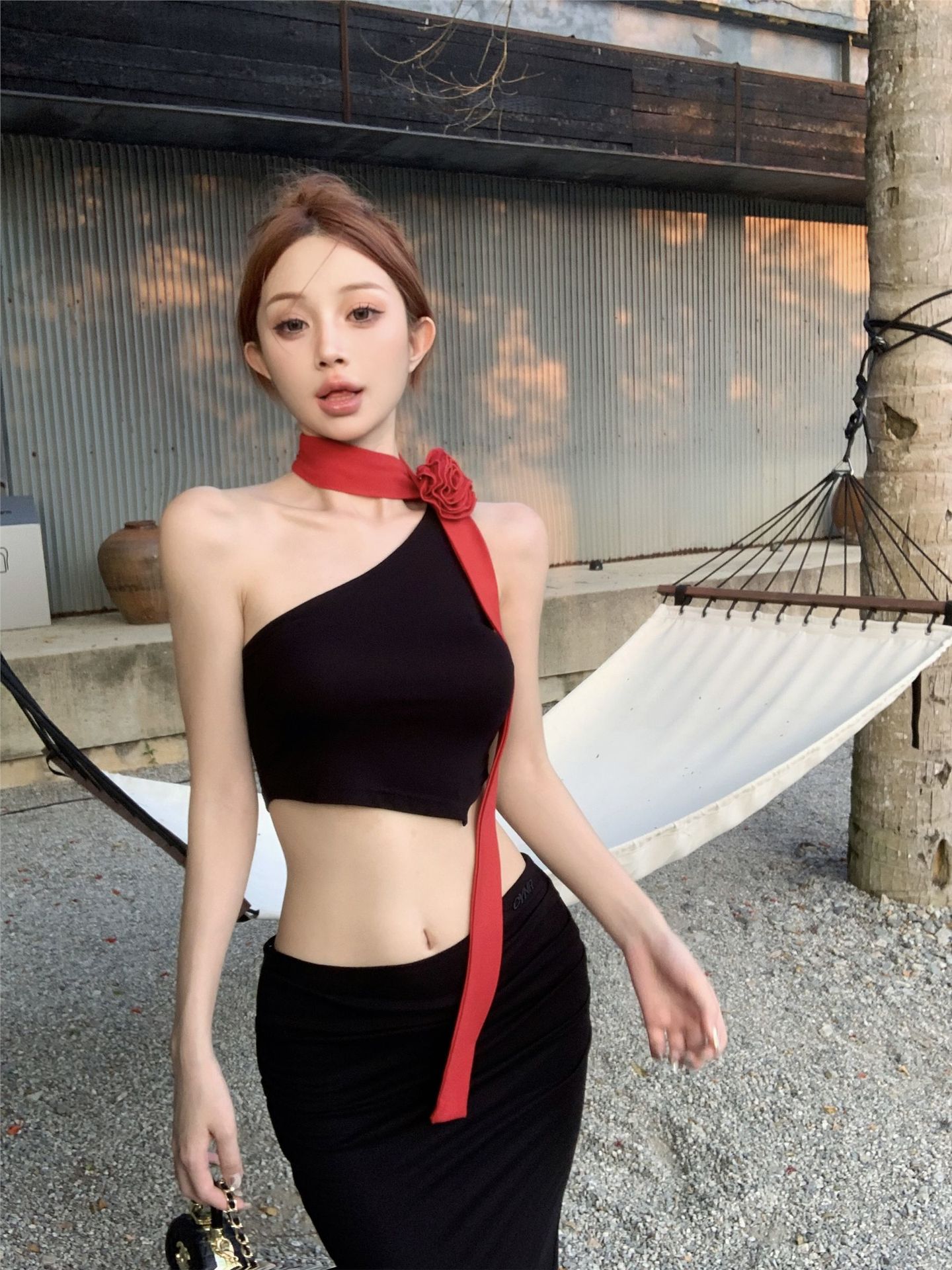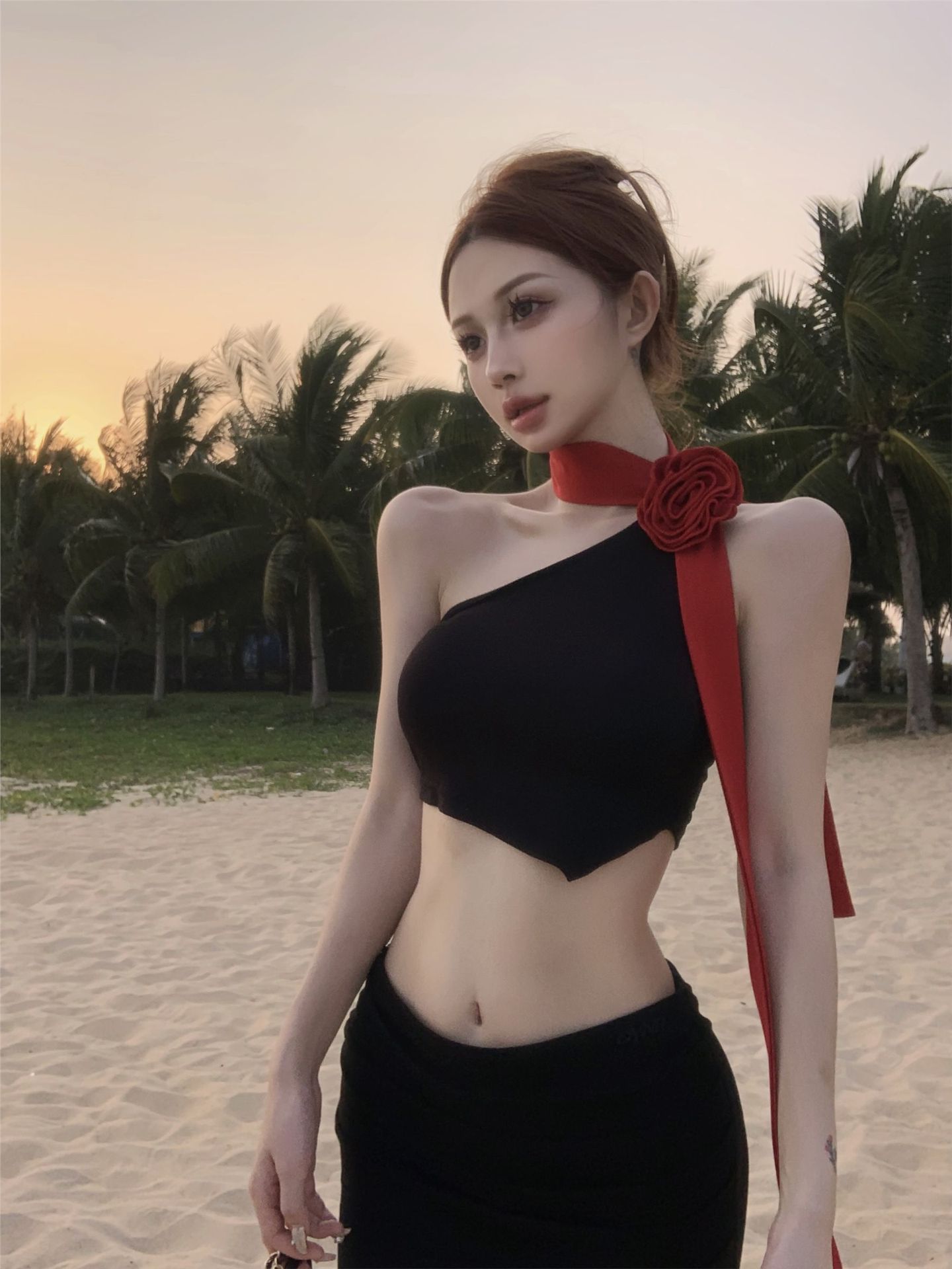 花朵吊带背心女外穿夏季泰式甜热辣妹抹胸斜肩上衣