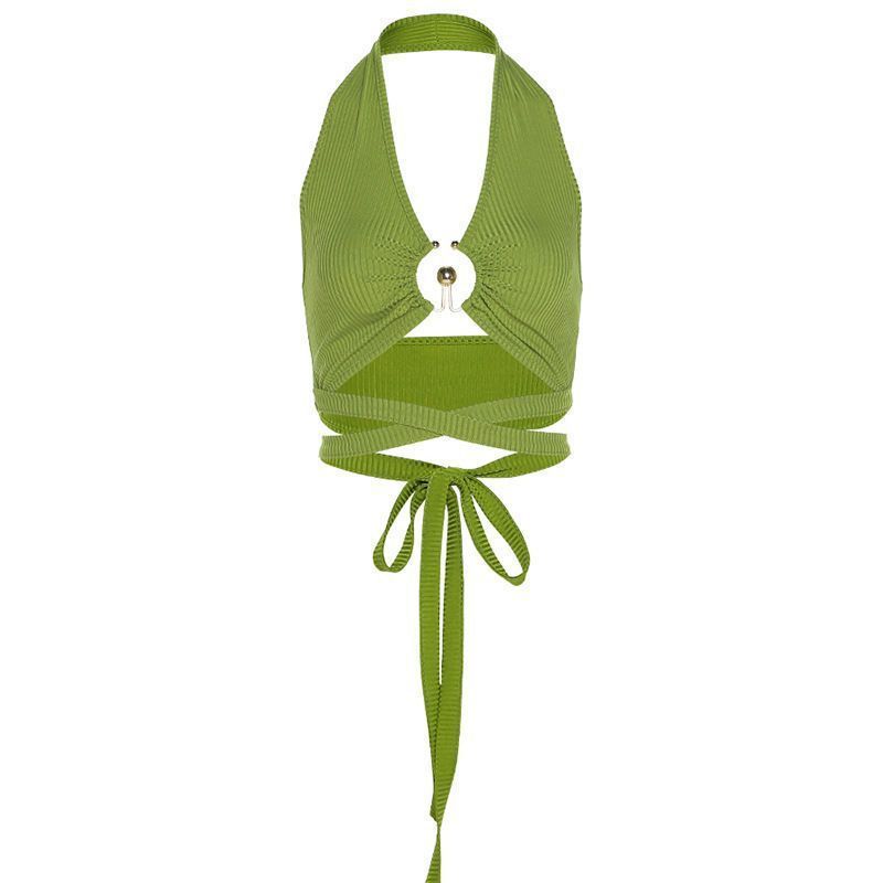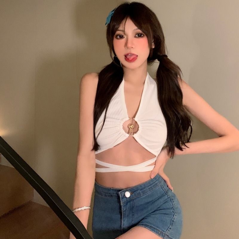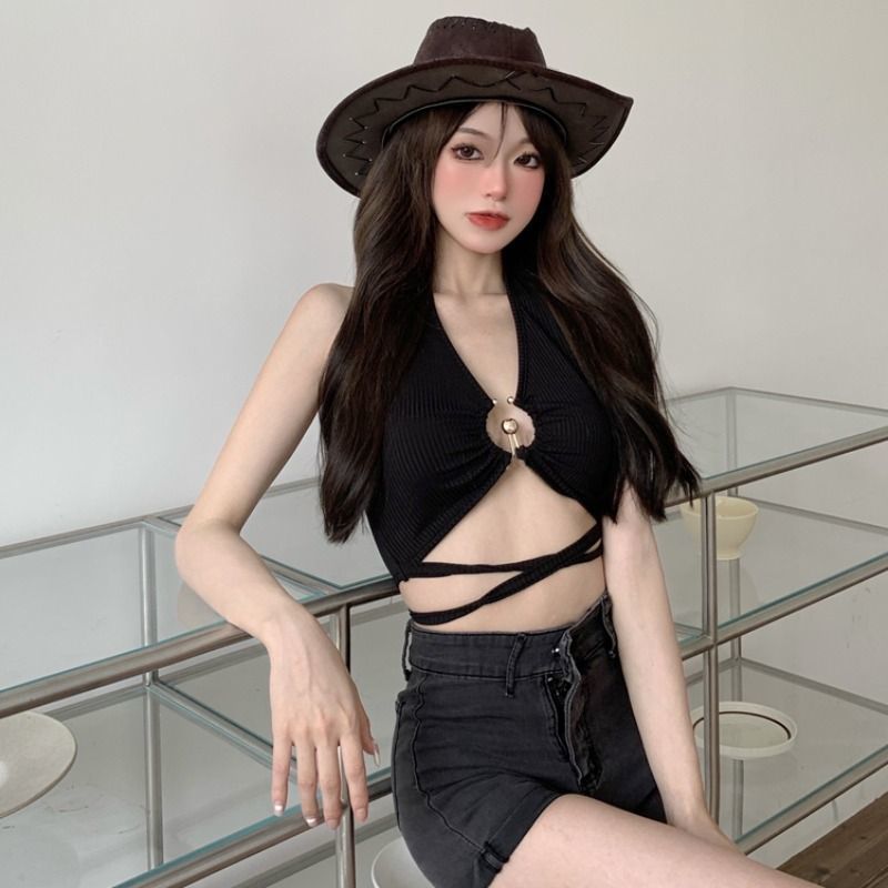夏季新款网红性感挂颈小设计金属圆环系带收腰吊带