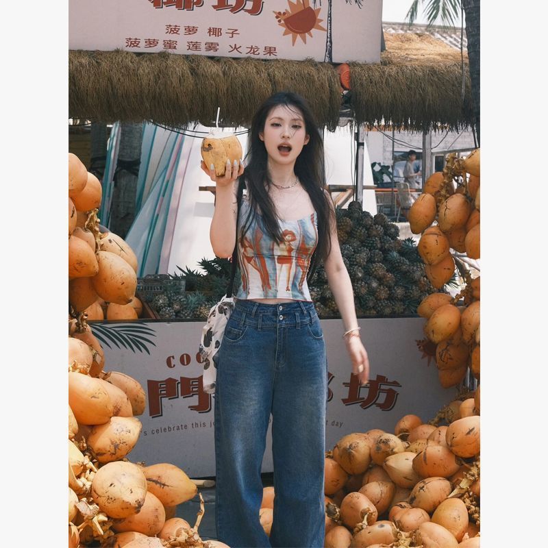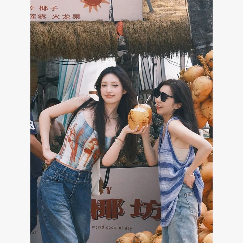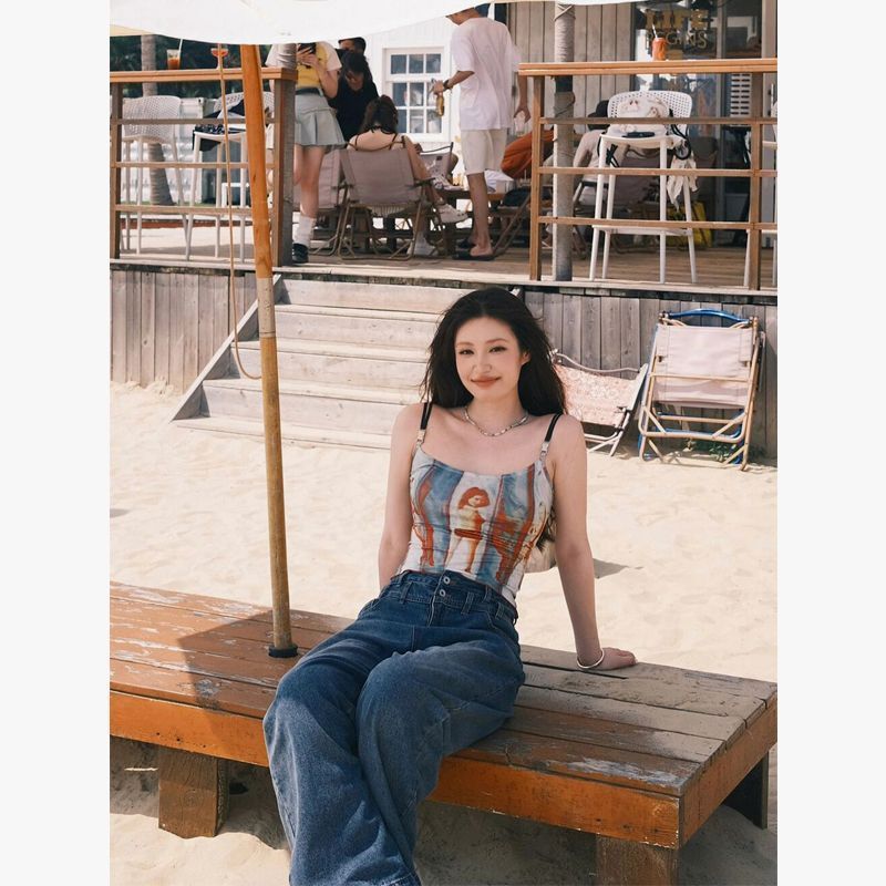港风复古辣妹红蓝调印花吊带背心女新款收腰修身显瘦性感短款上衣