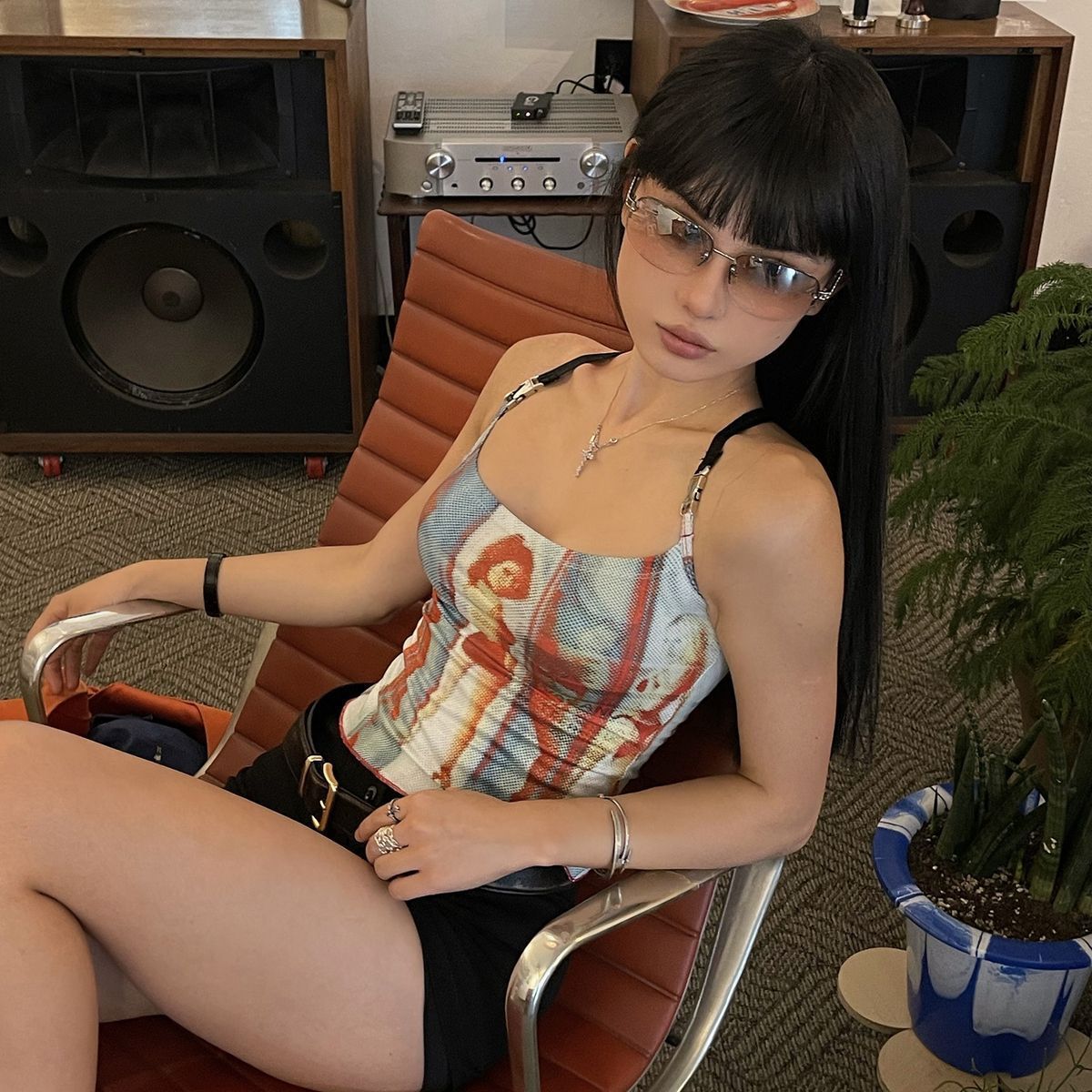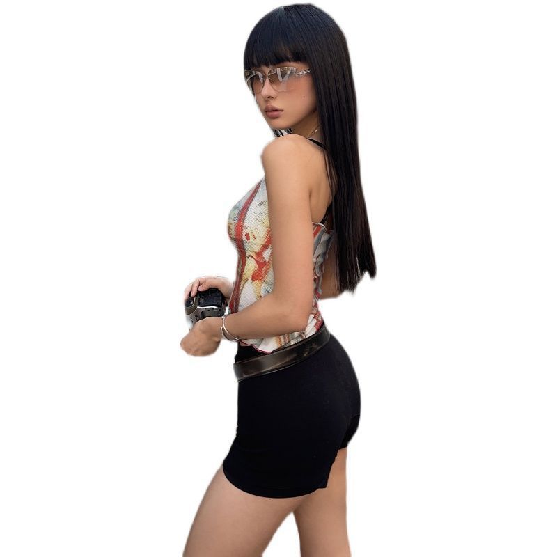 【月销10万】辣妹收腰凸显身材吊带背心设计感小众红蓝调印花上衣
