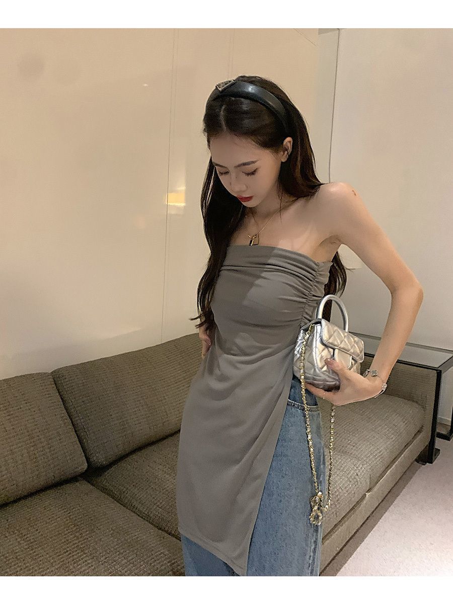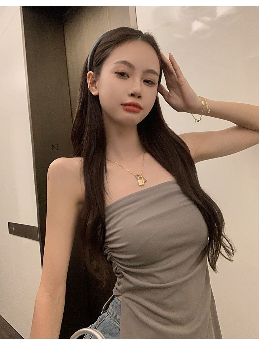 【来版可做】开叉露肩性感抹胸背心夏季辣妹别致褶皱裹胸上衣女