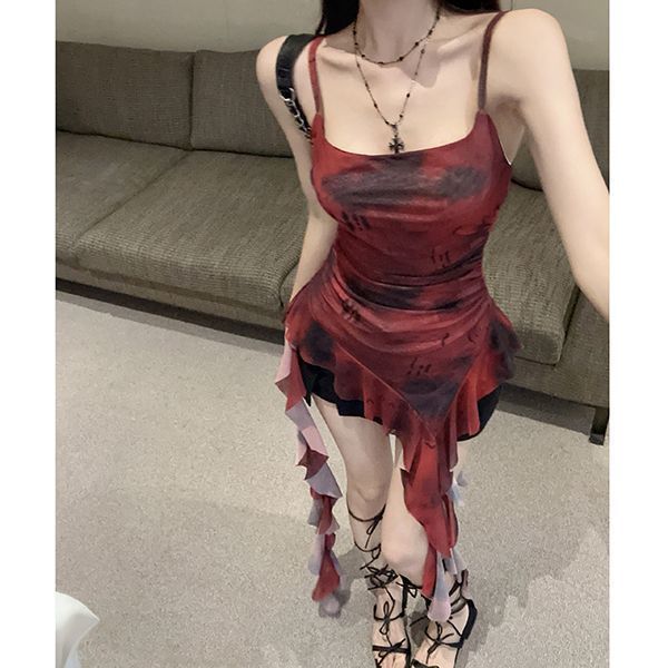泰国东南亚荷叶边吊带背心夏季纯欲辣妹红色修身不规则上衣外穿
