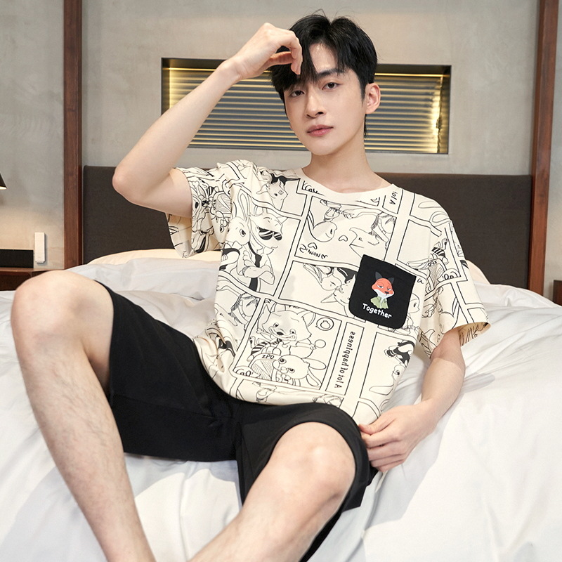 夏季纯棉男士睡衣短袖卡通印花短裤青少年薄款大码家居服套装