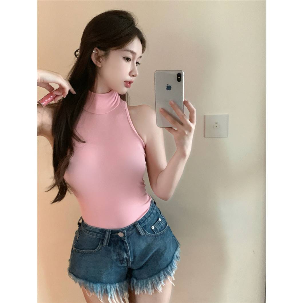 半高领无袖显胸大热辣修身美背弹力吊带背心夏季上衣