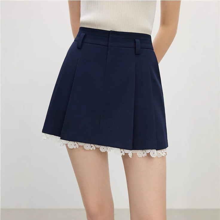 范思蓝恩 学院风A字百褶高腰半身裙女春夏2025新款蕾丝花边短裙