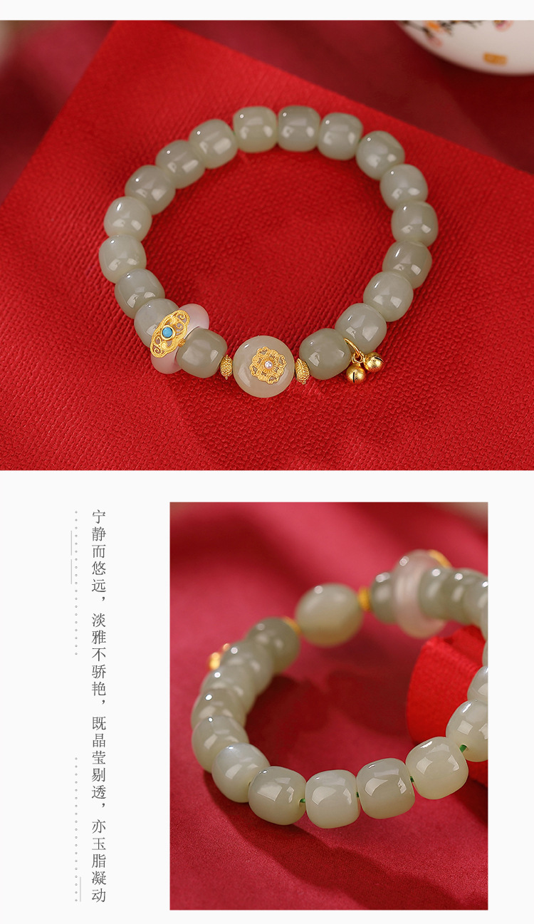 S925纯银镀金和田青玉平安扣铃铛手串高档百搭初夏手链原创轻奢