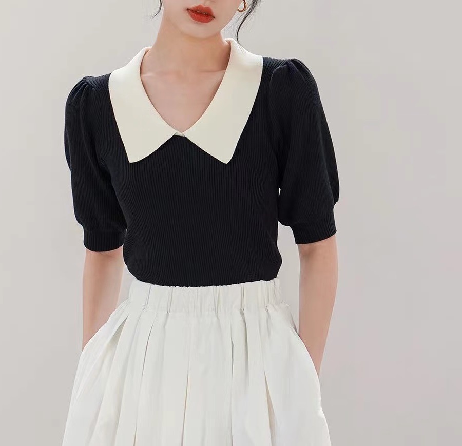 法式娃娃领针织衫女设计感小众冰丝t恤泡泡袖经典黑夏季新款上衣
