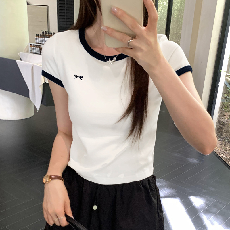 韩系别致蝴蝶结印花撞色短袖T恤女夏季新款爆款正肩显瘦上衣