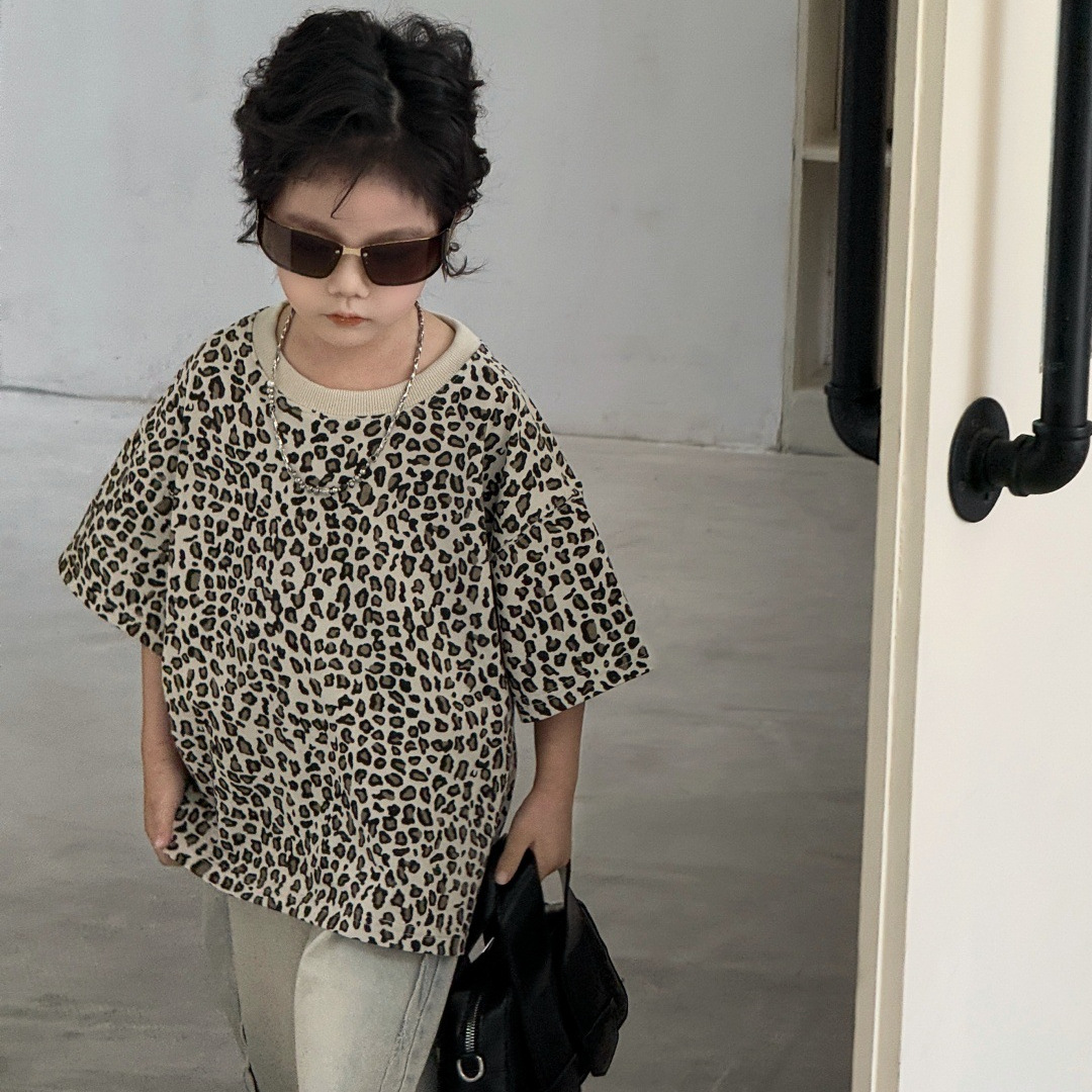 小男孩儿童T恤2025年夏季短袖洋气时尚豹纹半袖男童女童潮酷上衣