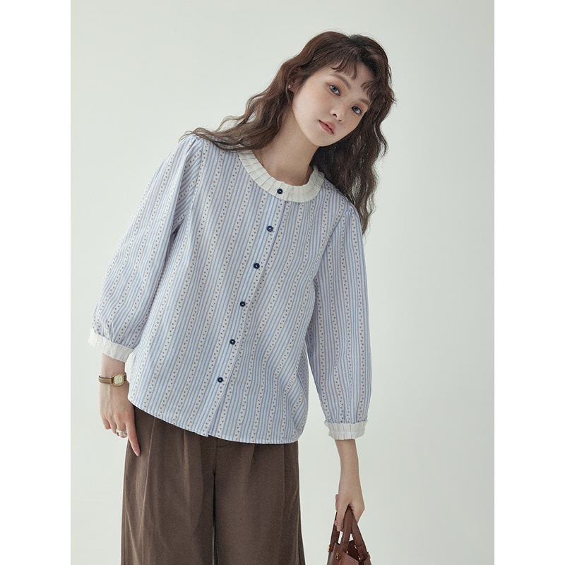 「北岛AMUU原创」日系拼色花边单排扣衬衫女春季新款显瘦长袖上衣