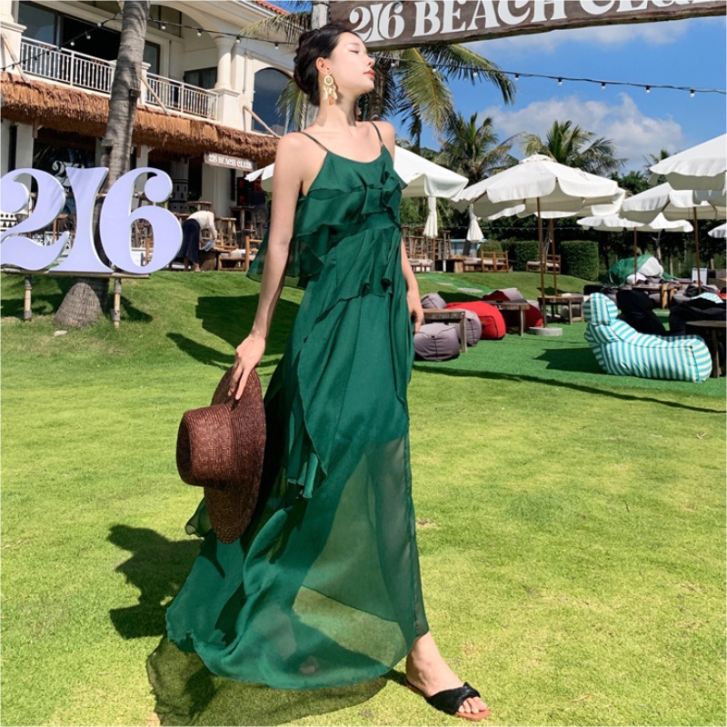 海边度假裙吊带连衣裙雪纺沙滩裙女夏超仙绿色荷叶边露肩长裙