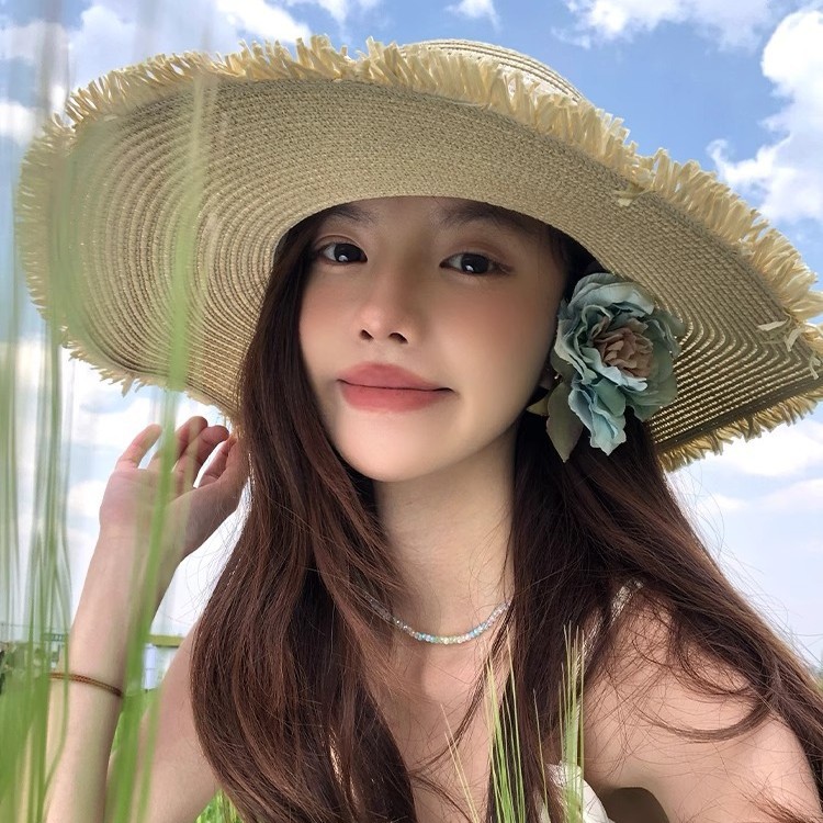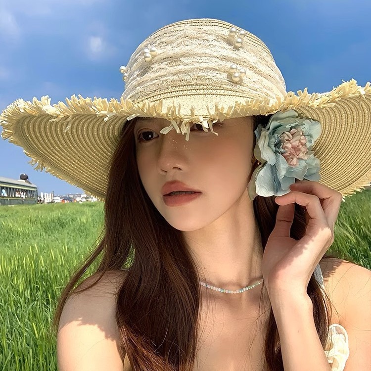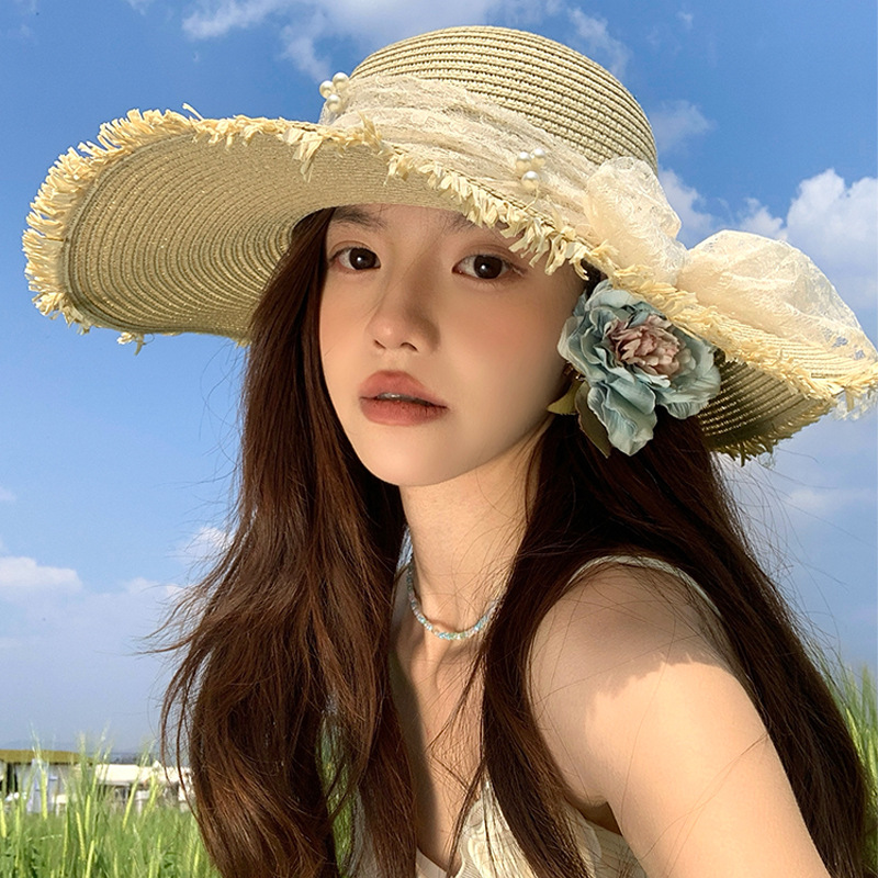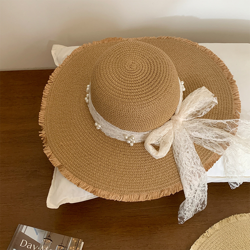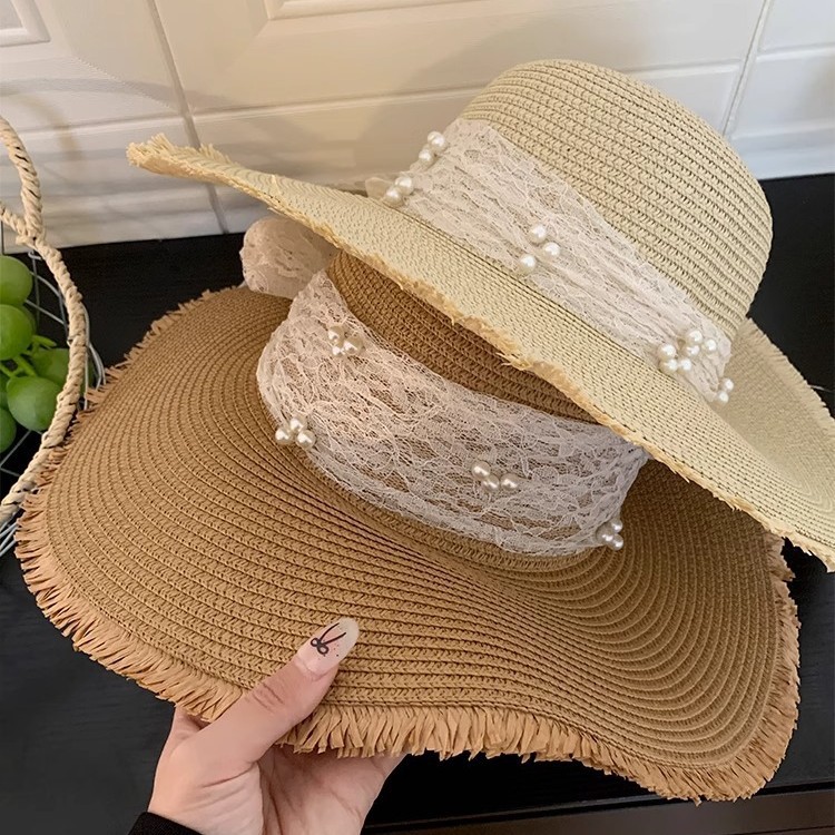 蕾丝蝴蝶结编织草帽女夏季大帽檐海边度假沙滩遮阳防晒帽太阳帽子