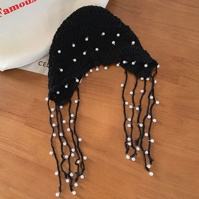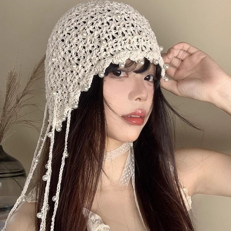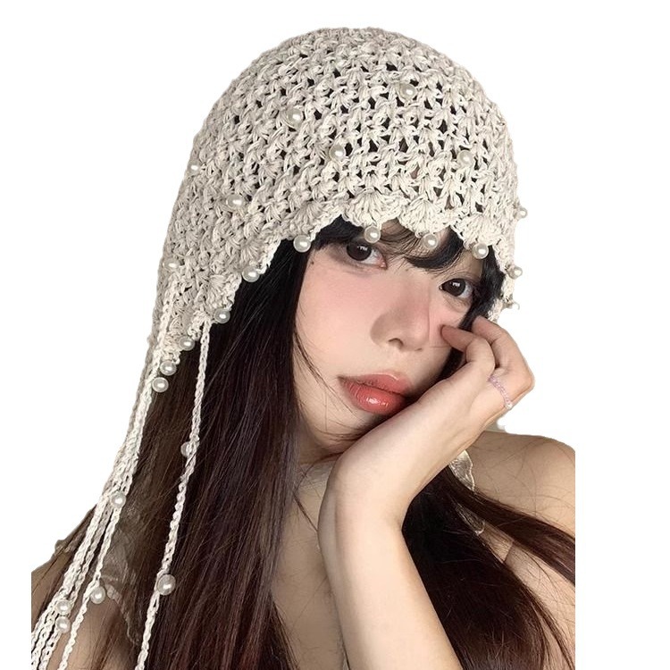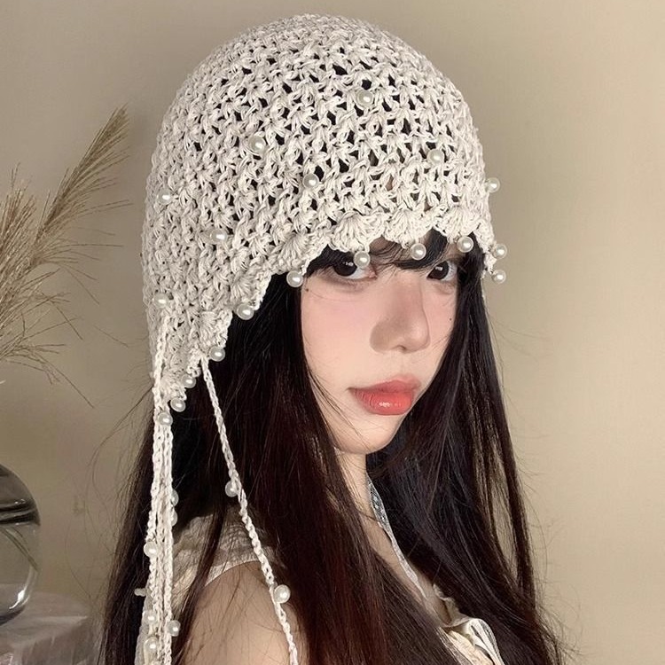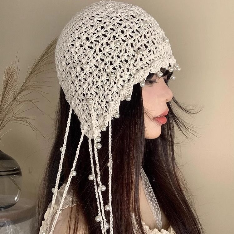 镂空珍珠流苏吊坠包头帽女夏季民族风针织套头帽复古显脸小帽子