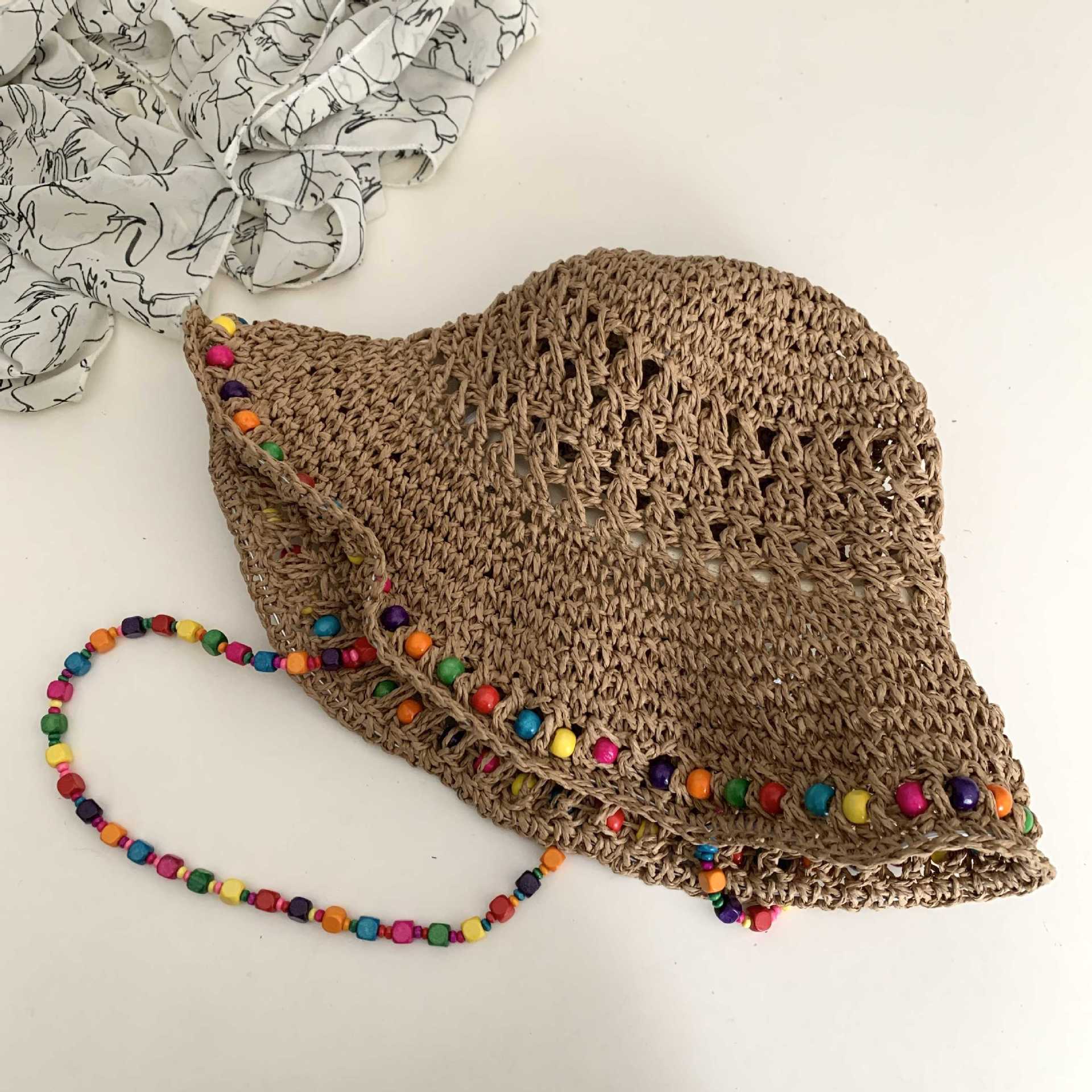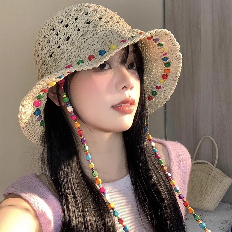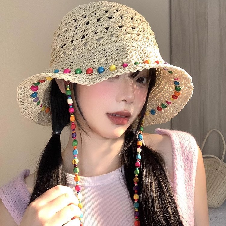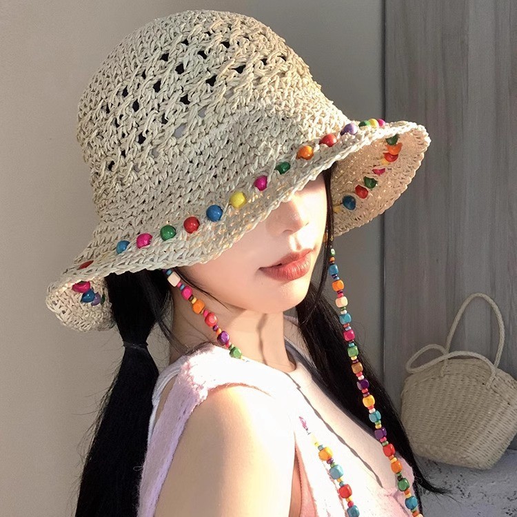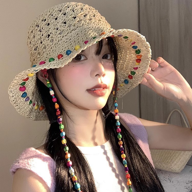 泫雅风彩色木珠草帽女夏季镂空大帽檐遮阳防晒帽可折叠渔夫帽子潮