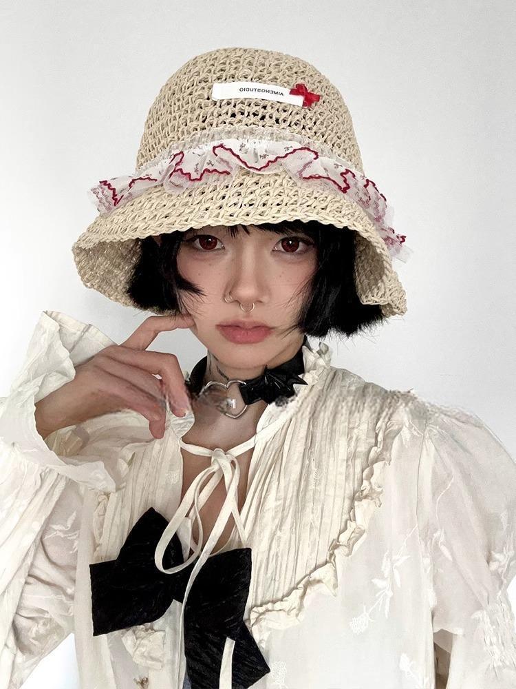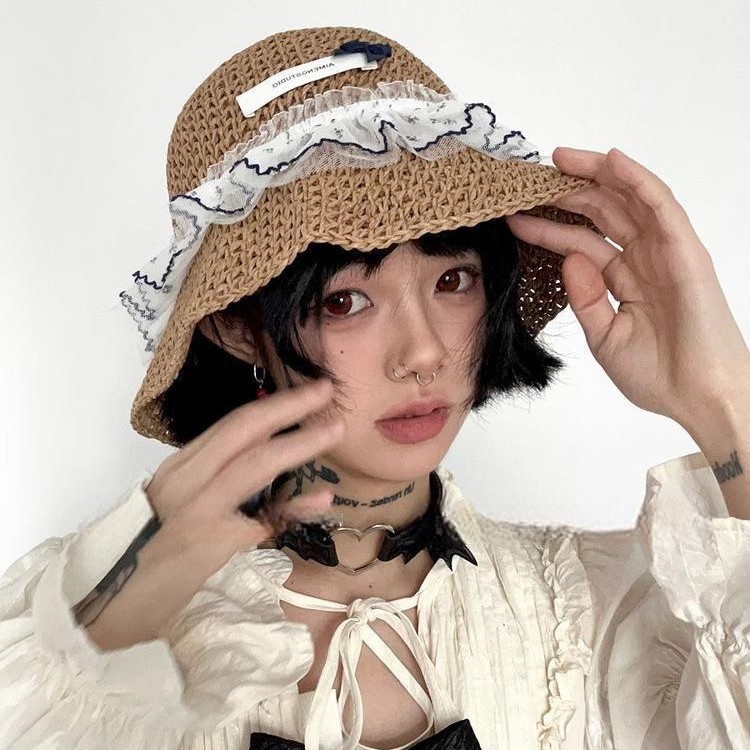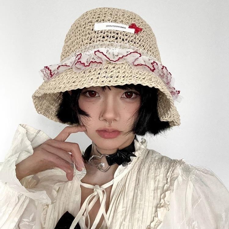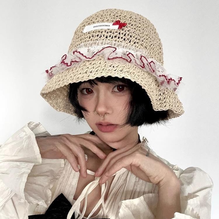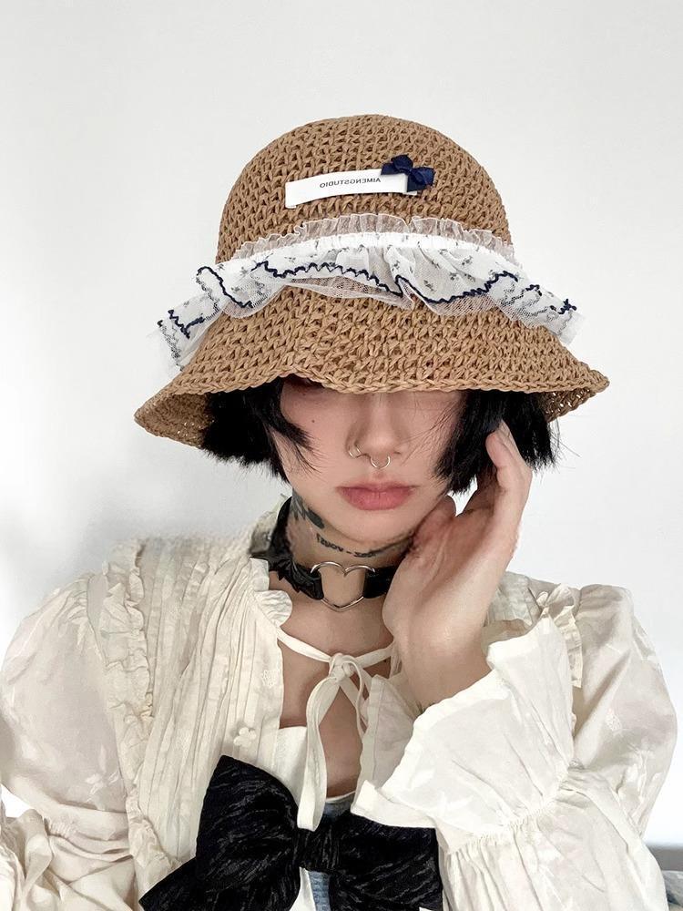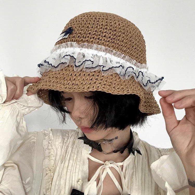 韩系度假风蕾丝少女渔夫帽女海边遮阳编织太阳帽子女大檐甜美草帽