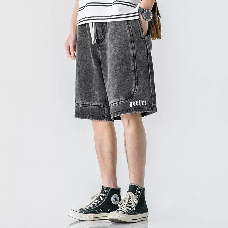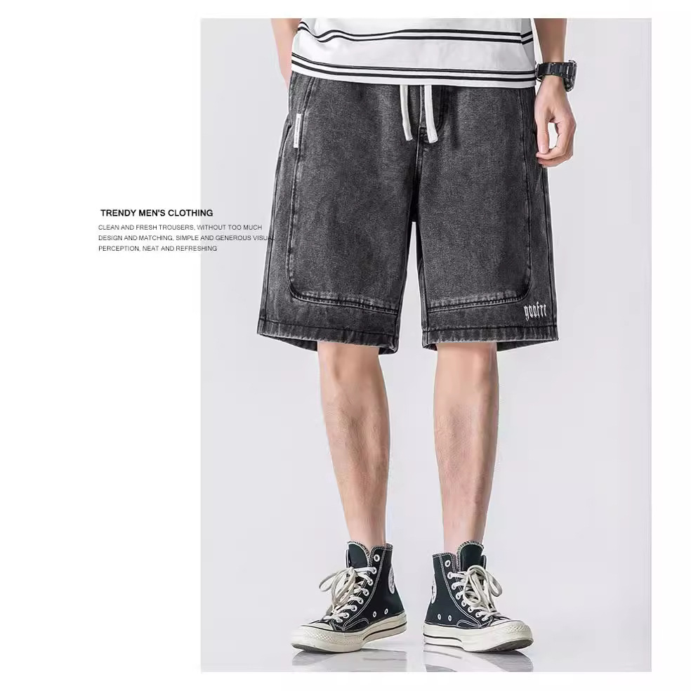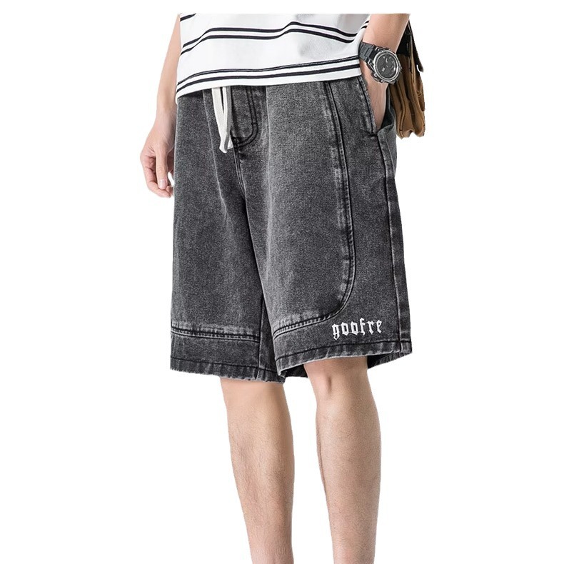夏季薄款松紧腰五分牛仔短裤男式中裤潮牌宽松青年牛仔五分裤男生