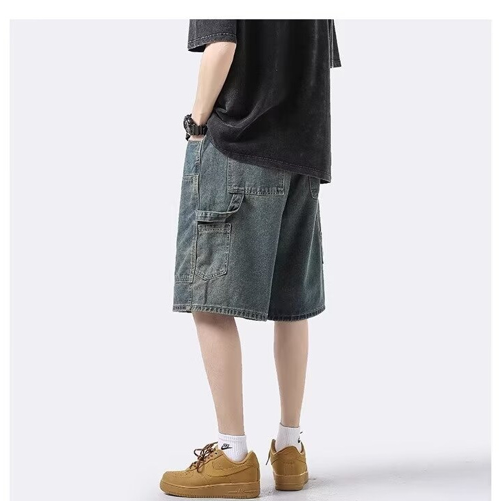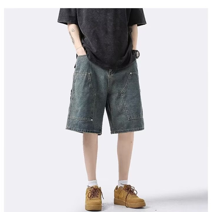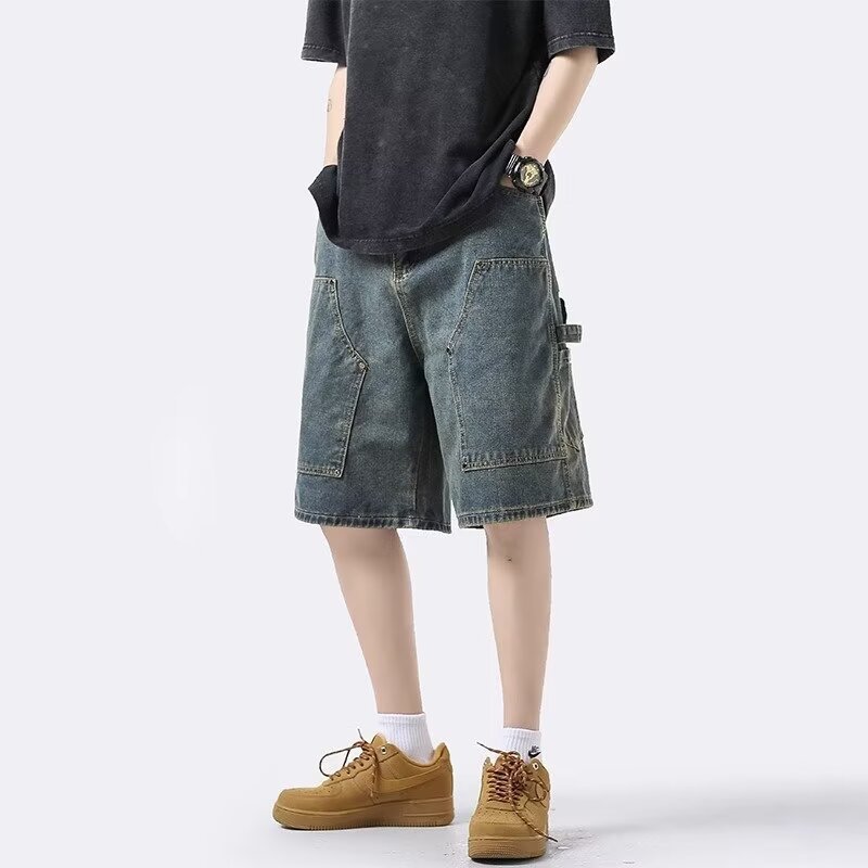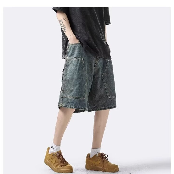 工装牛仔短裤男夏季薄款潮牌宽松直筒五分裤美式水洗休闲裤子
