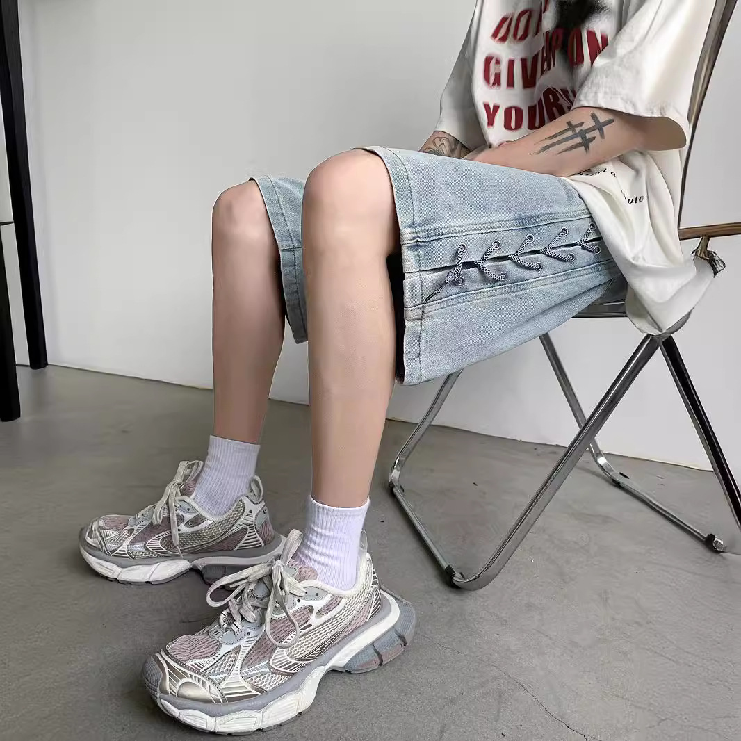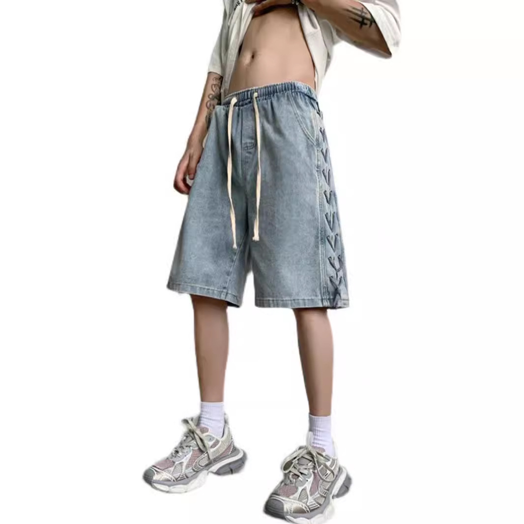美式高街小众重磅男生牛仔短裤高级感夏天织带宽松重工复古五分裤