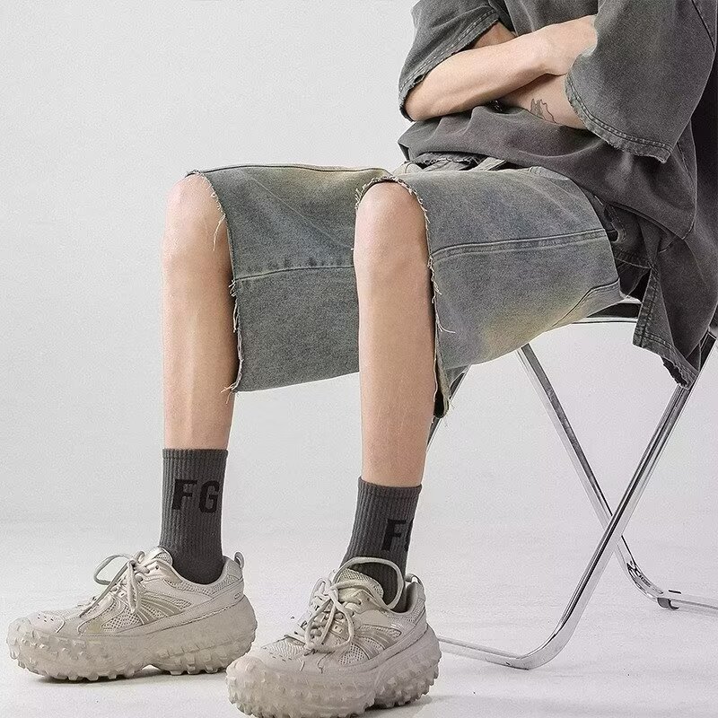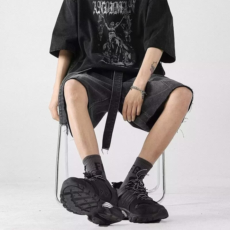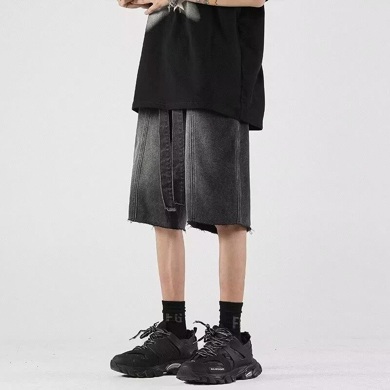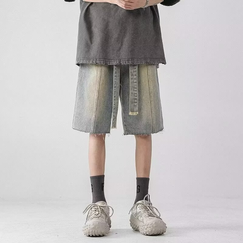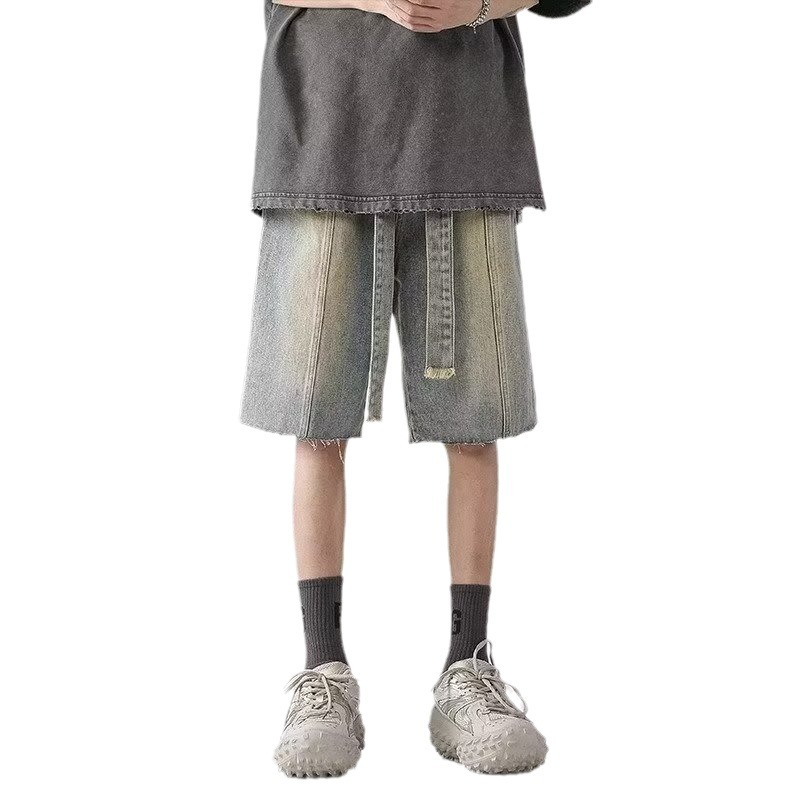 新款五分裤水洗青春流行牛仔裤男时尚直筒系绳宽松阔腿裤子潮