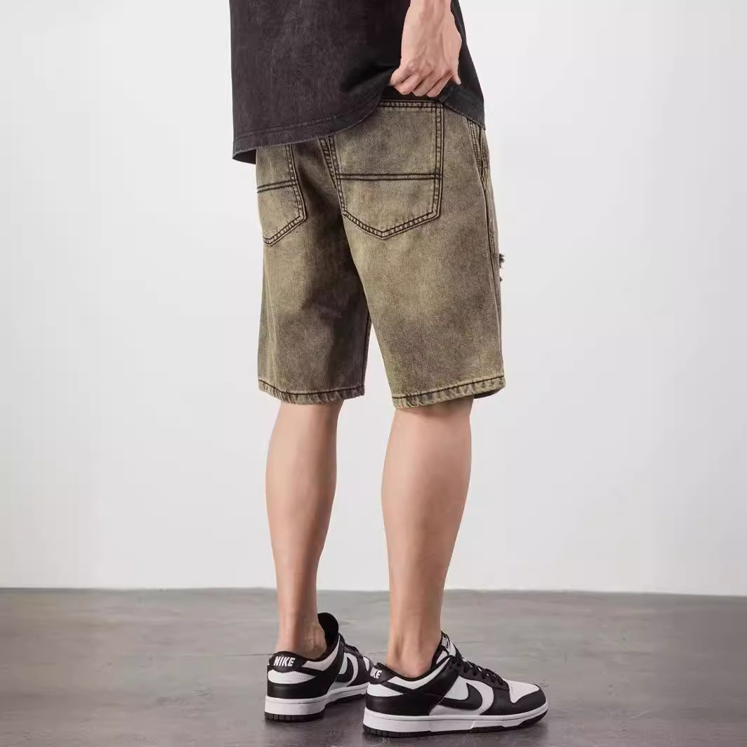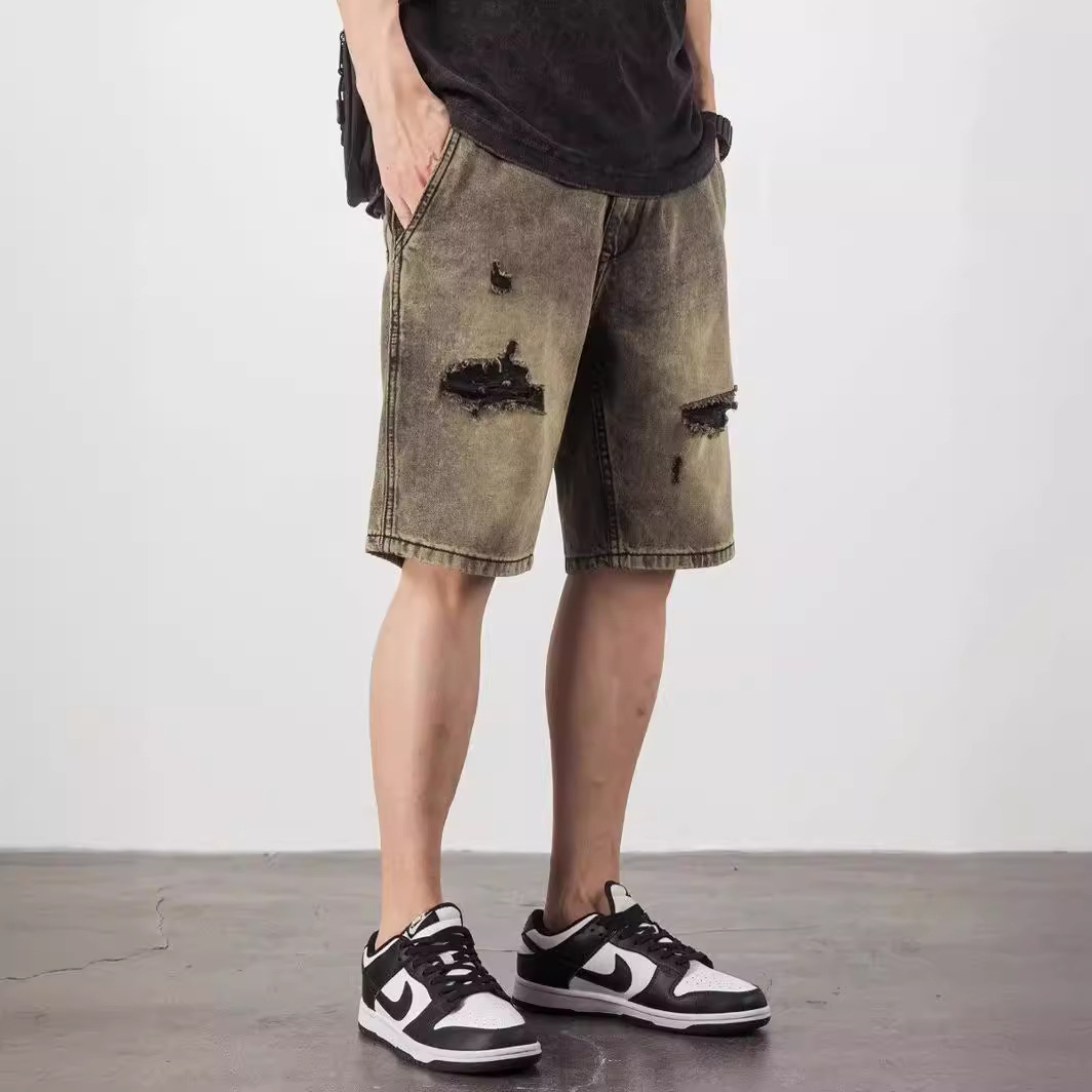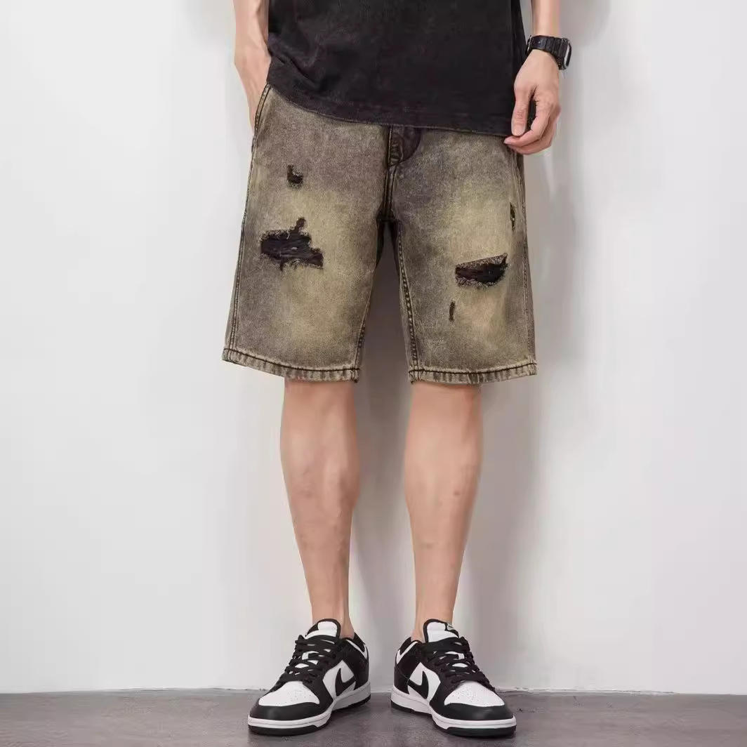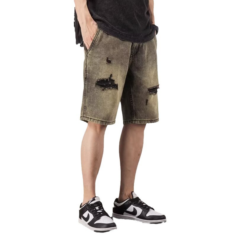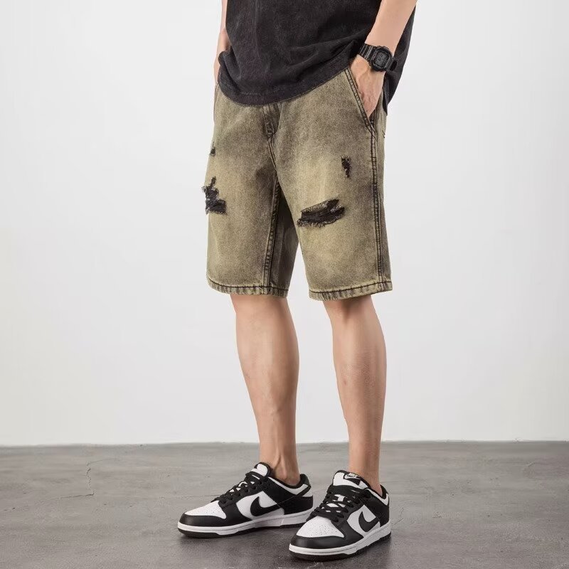 复古水洗五分牛仔短裤男破洞宽松夏季薄款分休闲中裤复古潮男裤子