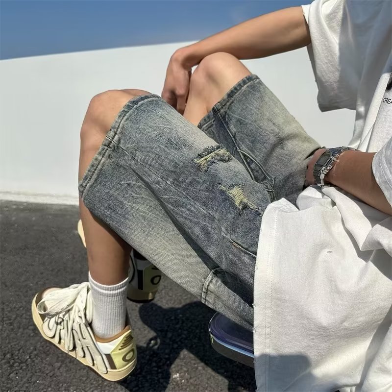 牛仔短裤男夏季高街潮牌新款休闲潮流五分裤宽松大码阔腿裤子