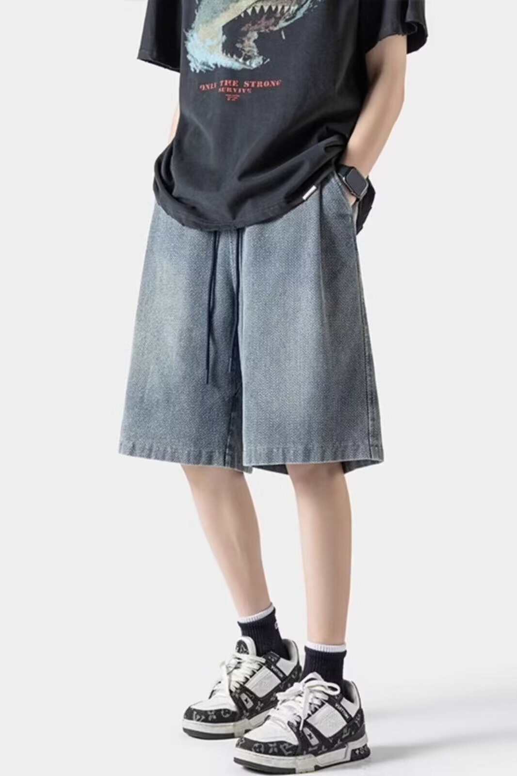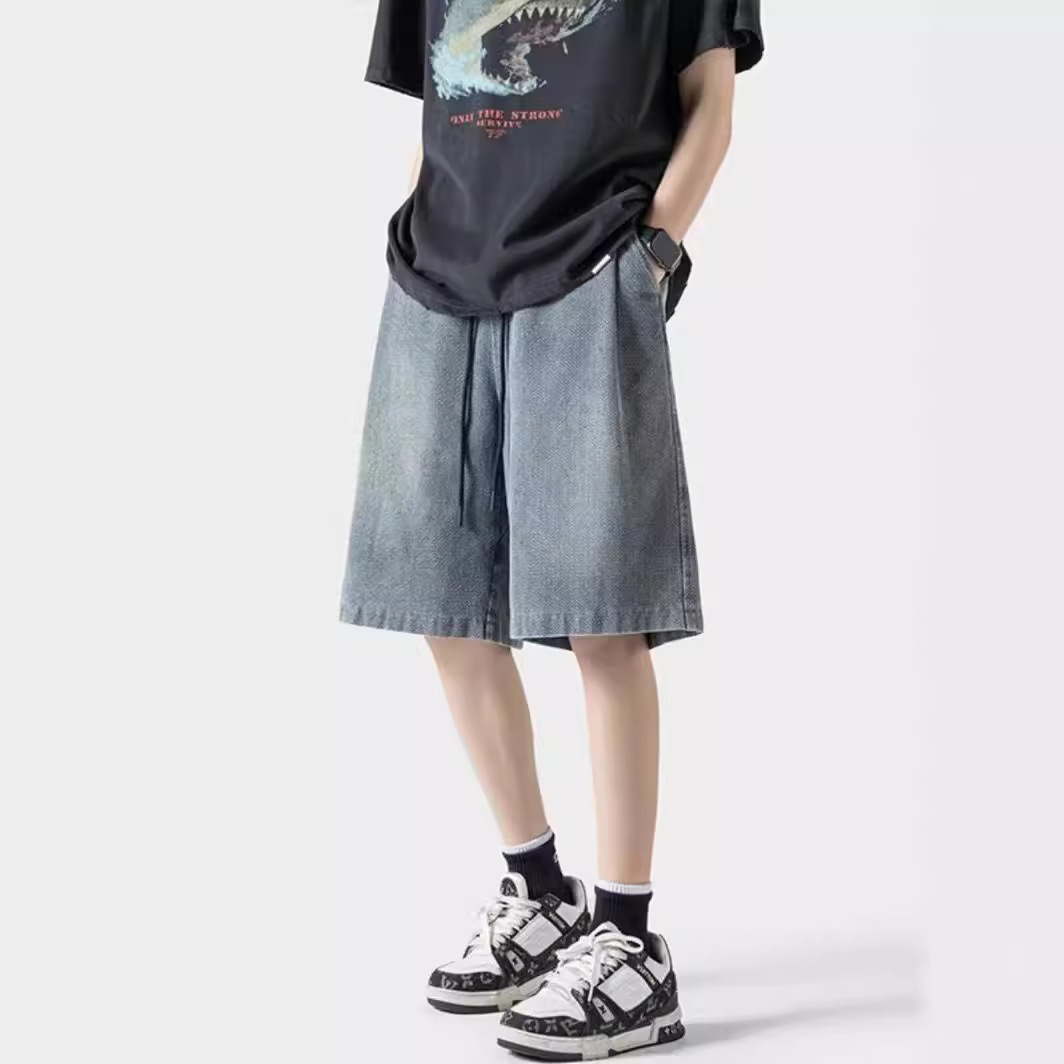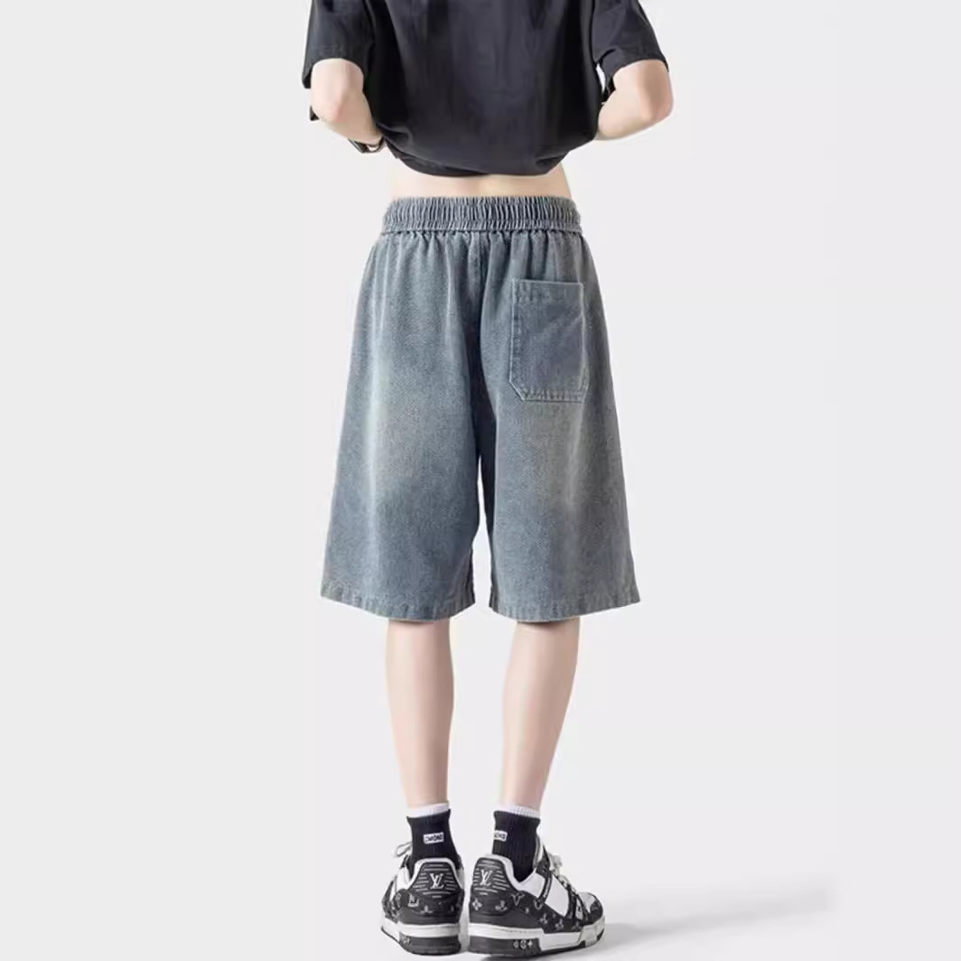 美式水洗直筒牛仔短裤男夏季新款情侣松紧腰宽松显瘦阔腿裤子