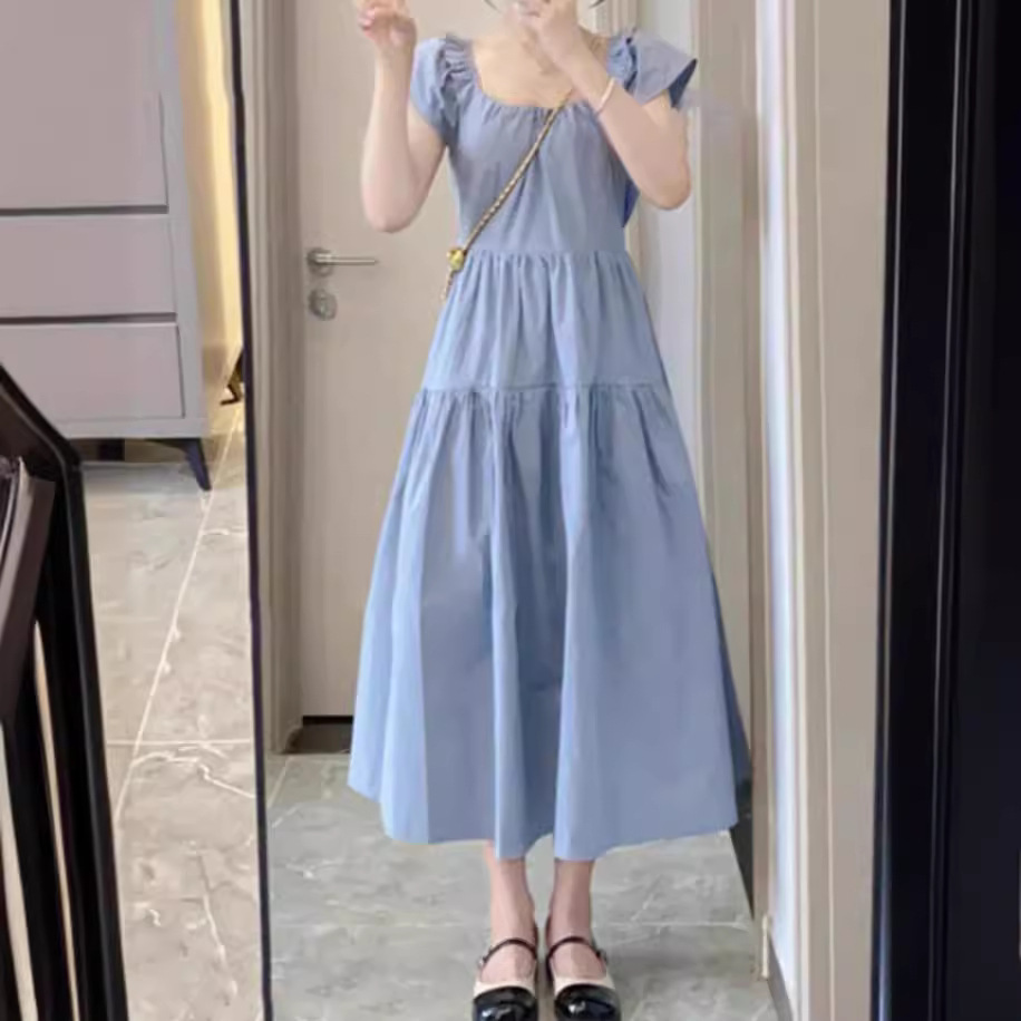 法式方领小飞袖宽松高腰显瘦连衣裙女夏季蓝色温柔风气质仙女长裙