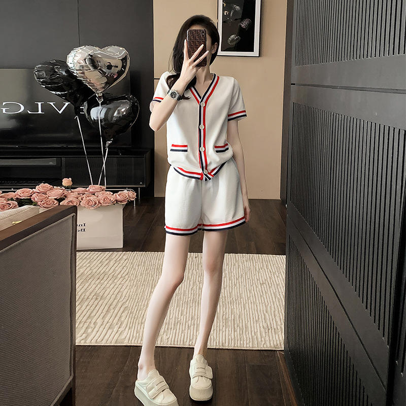 小香风套装女设计感气质短袖上衣女夏季高腰短裤裤子温柔风两件套