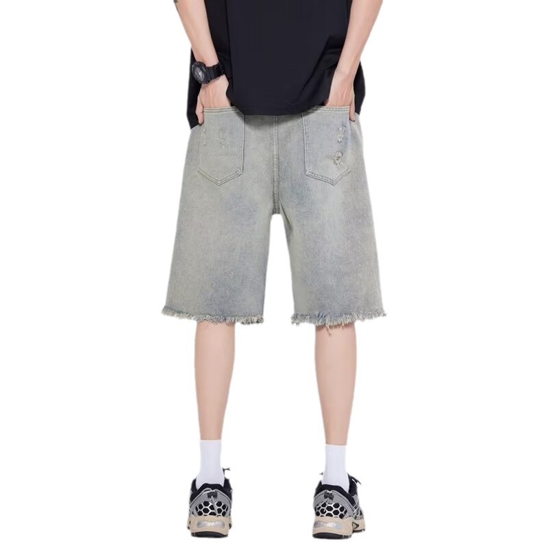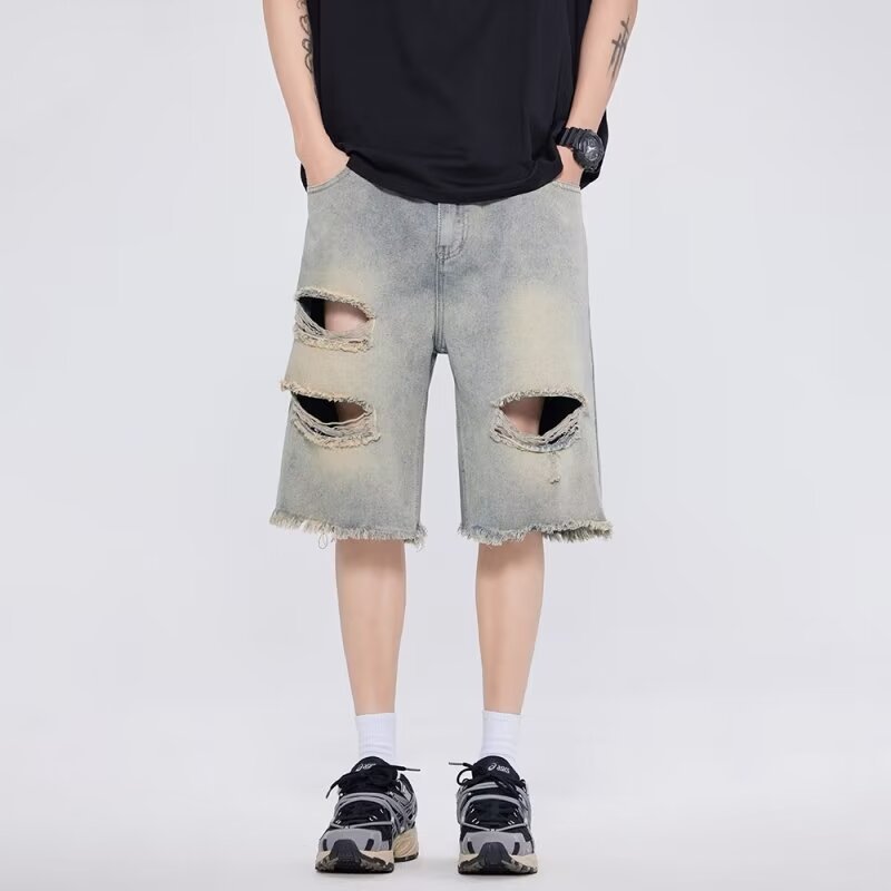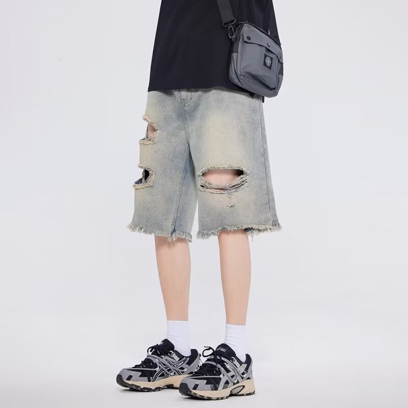 牛仔短裤男夏薄款破洞毛边裤子设计感小众高街潮牌ins爆款五分裤