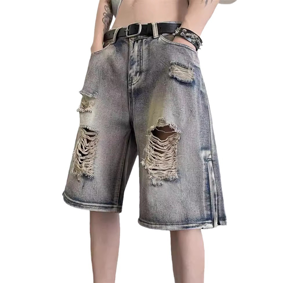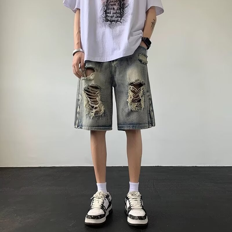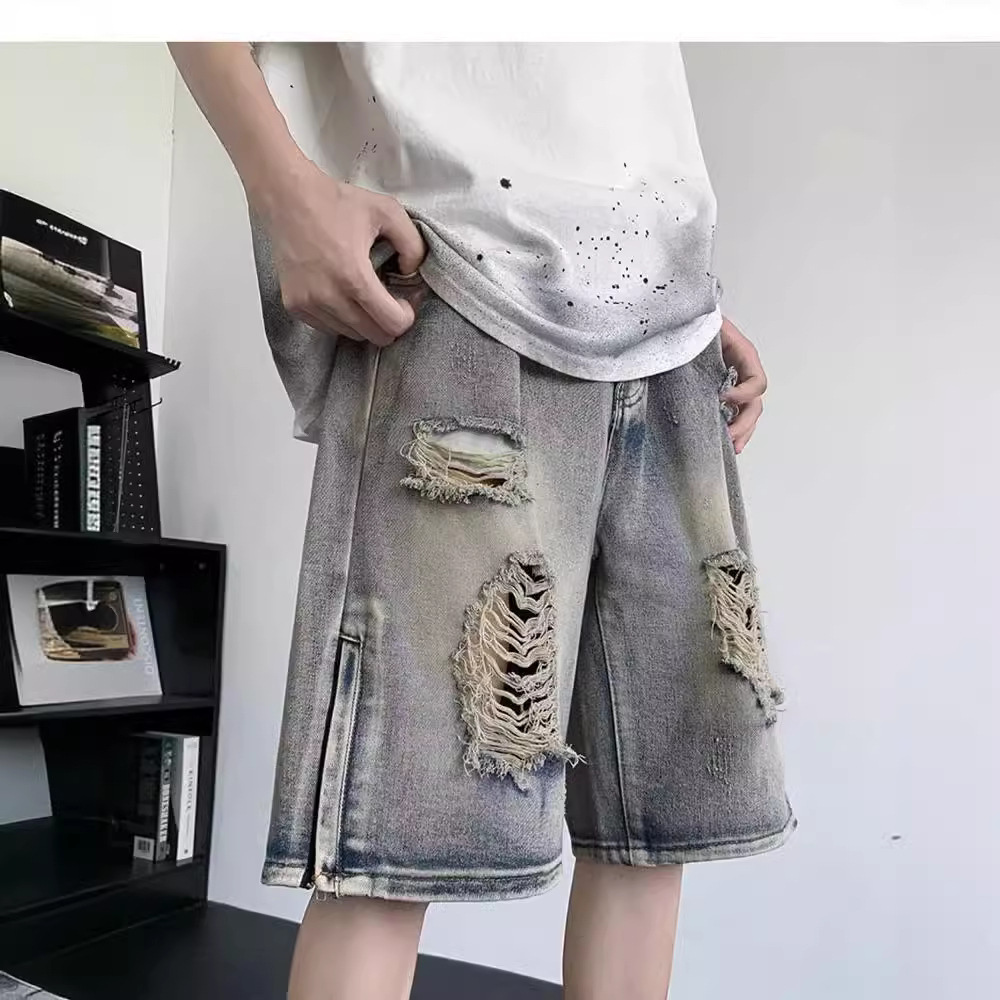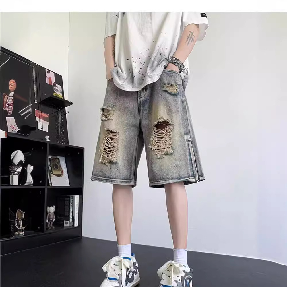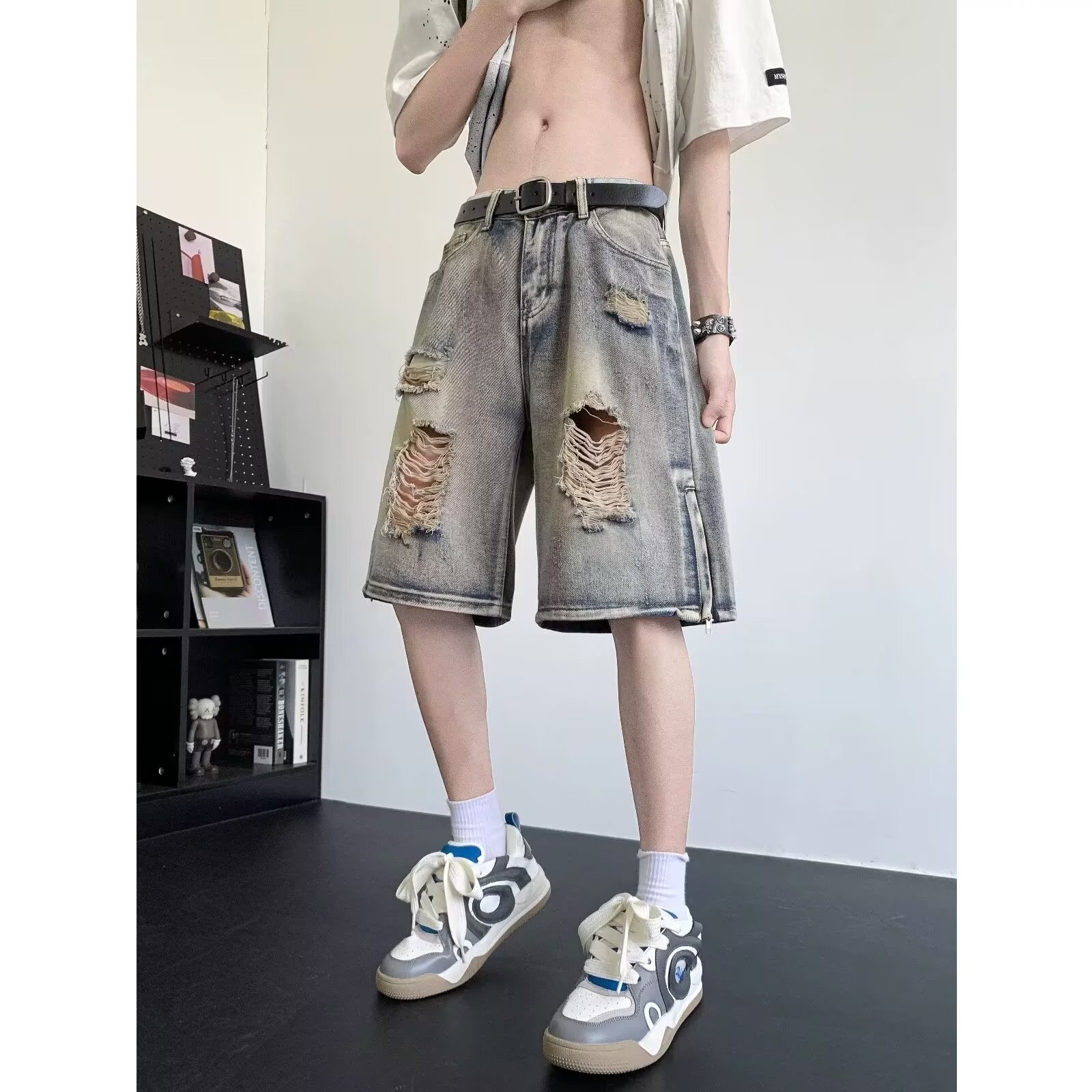 水洗做旧破洞牛仔短裤男夏季小众设计感拉链裤子美式潮牌五分中裤