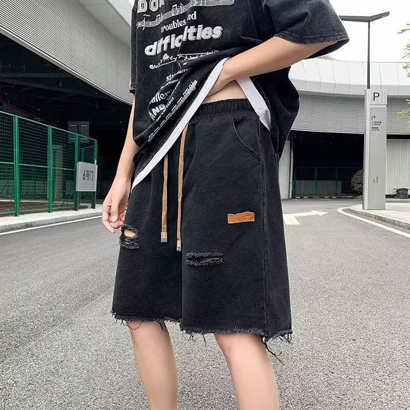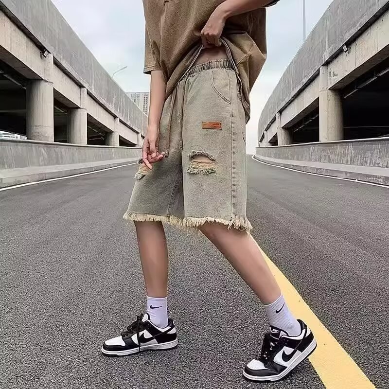 破洞牛仔短裤男夏季美式复古毛边设计感裤子高街潮牌宽松五分中裤