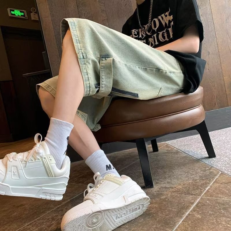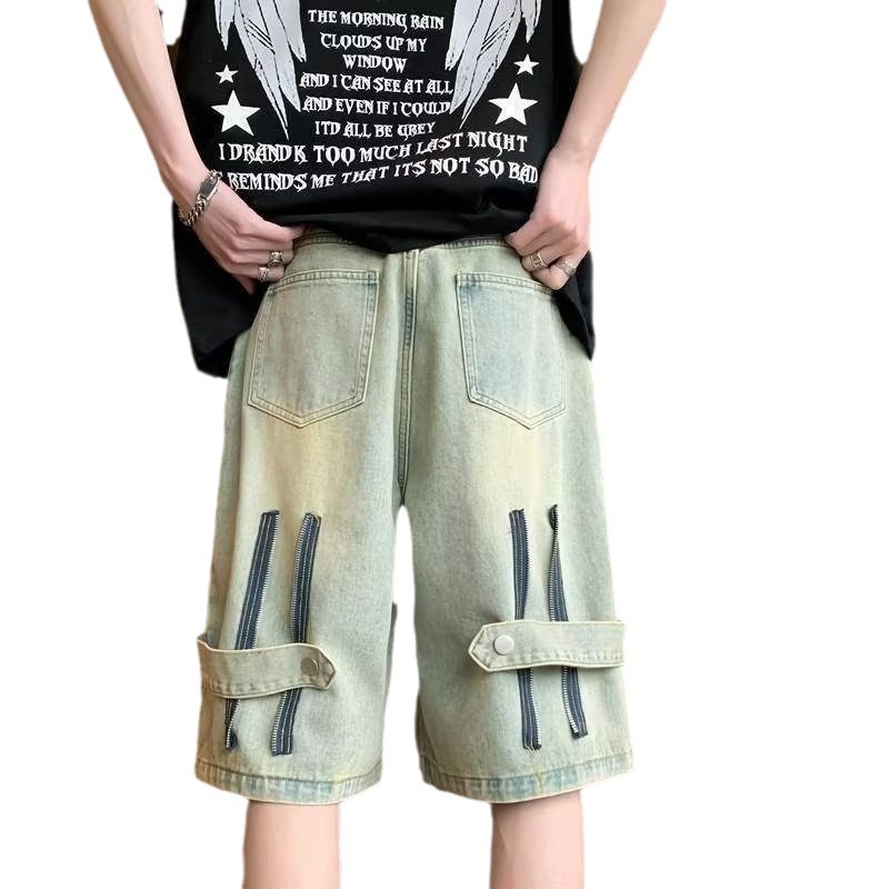美式复古五分裤黄泥色牛仔短裤男款夏季潮牌高街设计感拉链五分裤