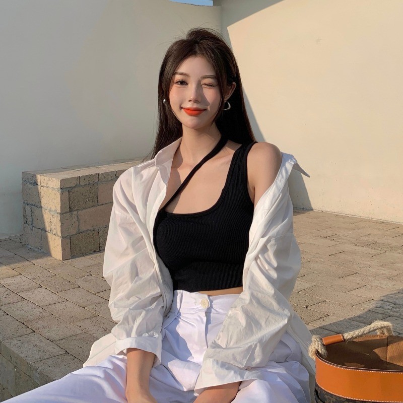 辣妹斜肩挂脖吊带美背内衣一体式胸垫固定杯裹胸外穿打底背心抹胸