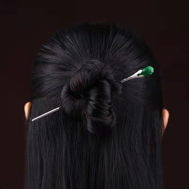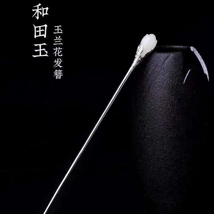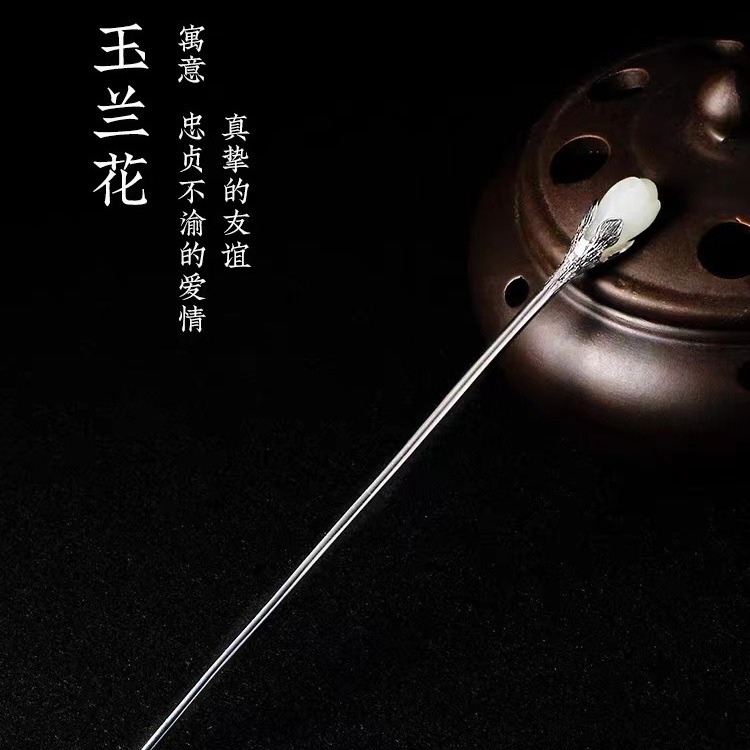 玉兰花简约一字发簪女S925银翡翠做旧百搭丸子头发饰古风簪子