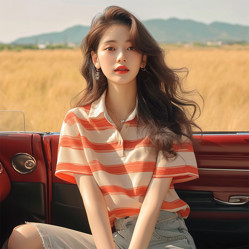 学院风短袖polo领上衣独特别致绝美小众设计感橙色条纹t恤女夏季