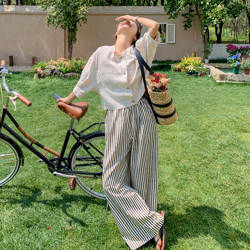 白色衬衫条纹阔腿裤套装夏新款一整套宽松透气休闲气质两件套
