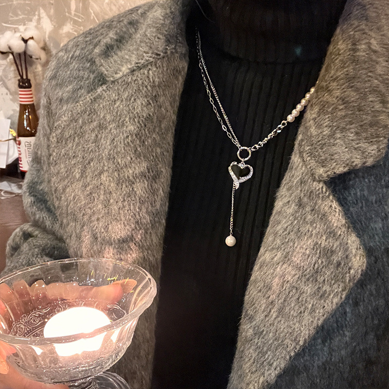 黑色镶钻爱心珍珠吊坠项链 ins潮小众轻奢设计感冷淡风辣妹锁骨链